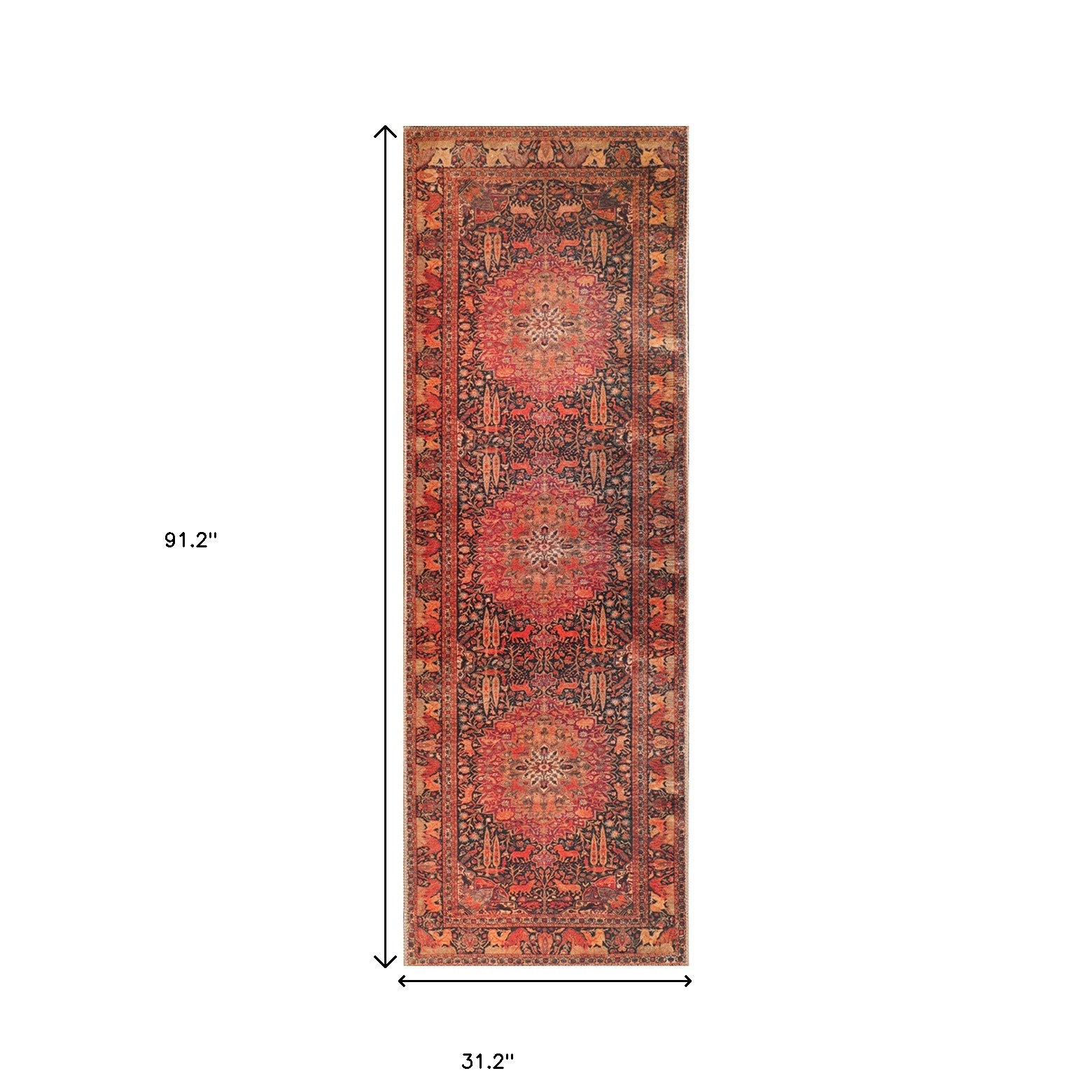 Set an inviting tone in your space with this 8-foot brown black and brick red medallion runner rug. Ideal for spaces with kids and pets, this rug is stain resistant to help repel dirt and spilled liquids. Built to last, this rug crafted from polyester fibers is known for its durability and long lasting appeal. Rugs are a great way to showcase your style, hide imperfections, warm your home and reduce noise. This transitional style runner makes a great accent for the hallway, in front of cabinets, in the laundry room, or any other space you need a narrow and long rug. 31.20-inch h x 91.20-inch w x 0.08-inch d.