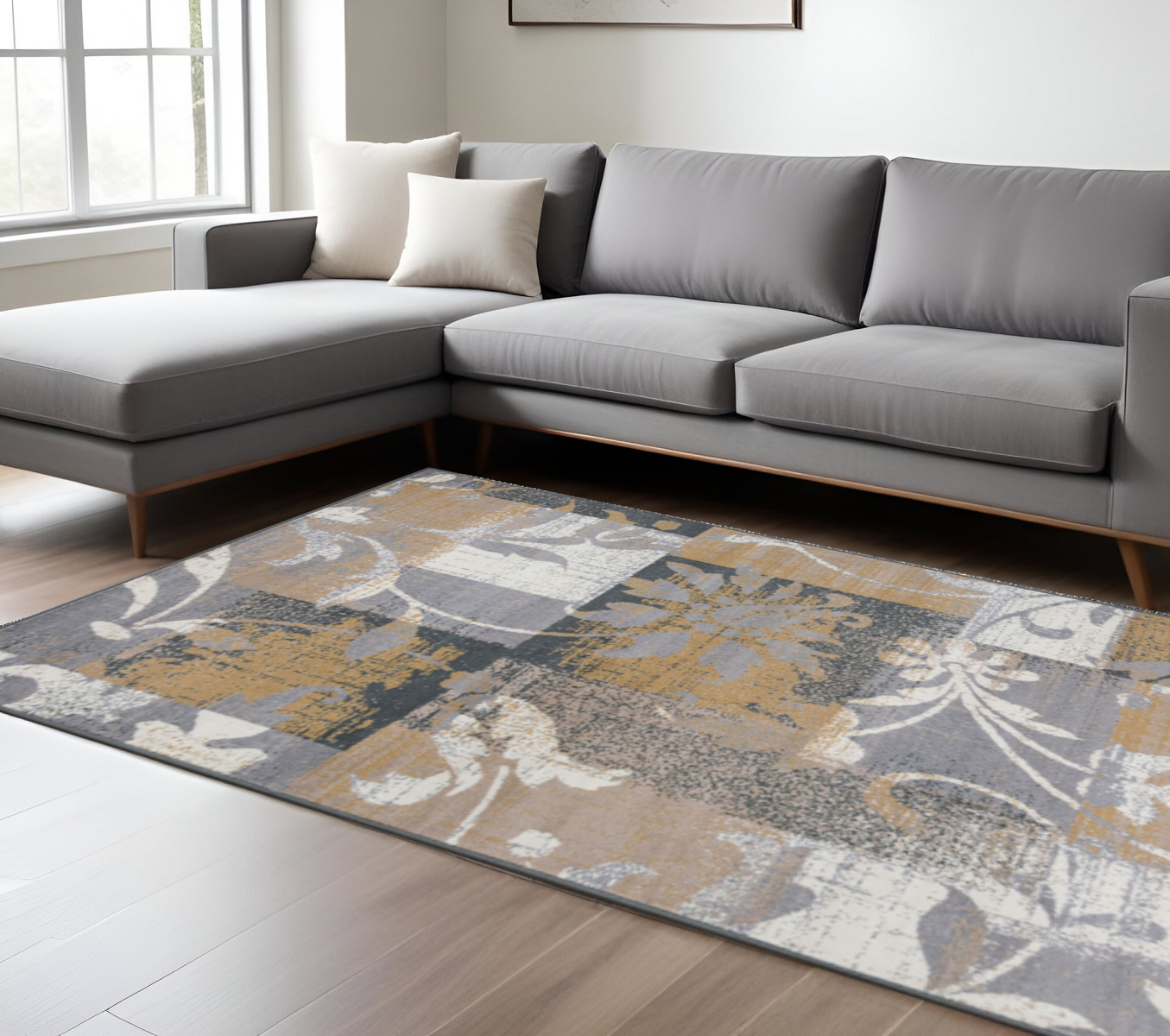 Add some artistry to your room with this 7-foot x 9-foot beige and black floral distressed area rug. Ideal for spaces with kids and pets, this rug is stain resistant to help repel dirt and spilled liquids. Built to last, this rug crafted from polypropylene fibers is known for its durability and long lasting appeal. Rugs are a great way to showcase your style, hide imperfections, warm your home and reduce noise. This larger sized, transitional styled rug is ready to create a focal point or statement piece in your room. 84.00-inch h x 108.00-inch w x 0.31-inch d.