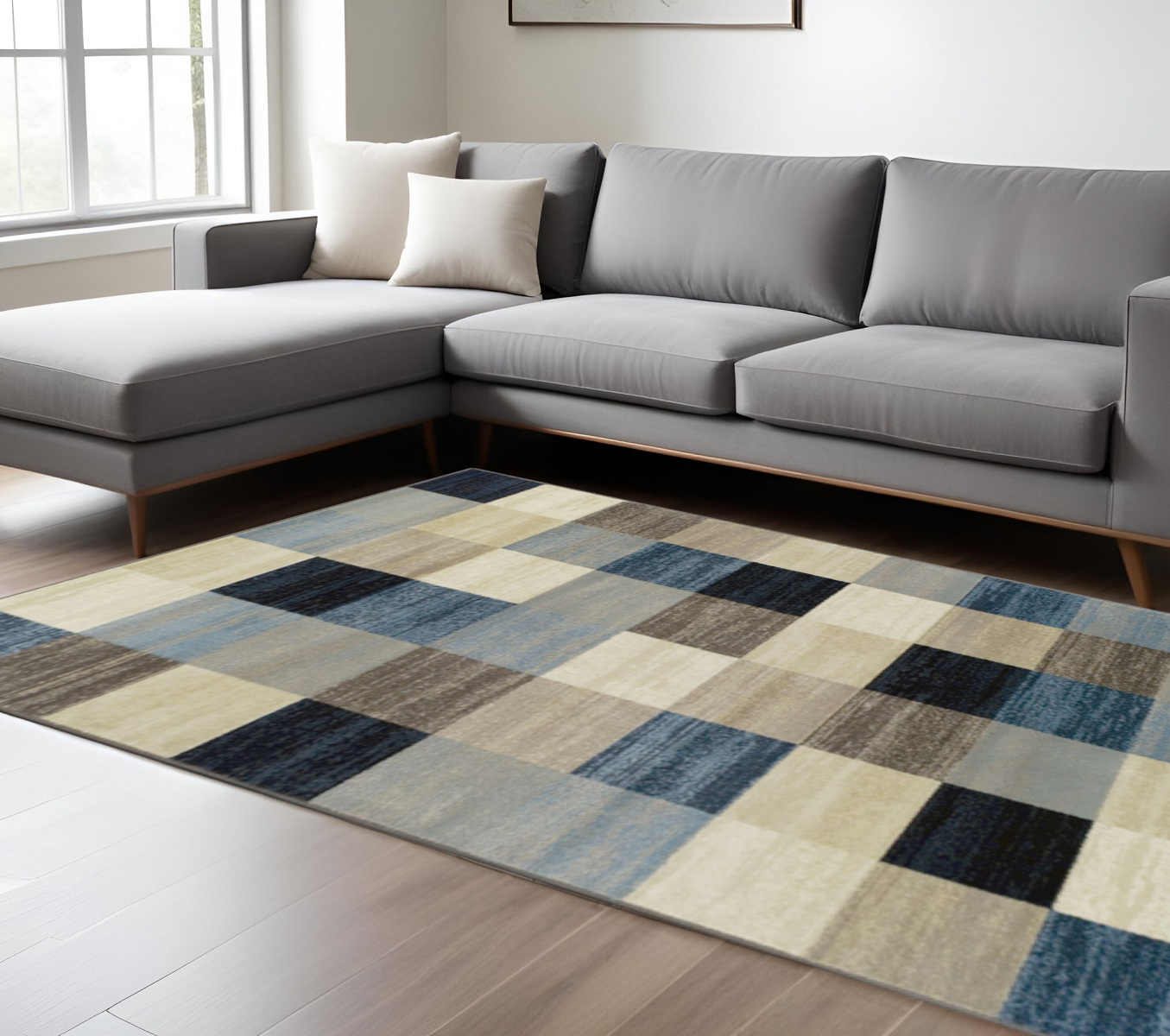 Add some artistry to your room with this 8-foot x 10-foot blue black and gray geometric area rug. Ideal for spaces with kids and pets, this rug is stain resistant to help repel dirt and spilled liquids. Built to last, this rug crafted from polypropylene fibers is known for its durability and long lasting appeal. Rugs are a great way to showcase your style, hide imperfections, warm your home and reduce noise. This larger sized, transitional styled rug is ready to create a focal point or statement piece in your room. 96.00-inch h x 120.00-inch w x 0.39-inch d.