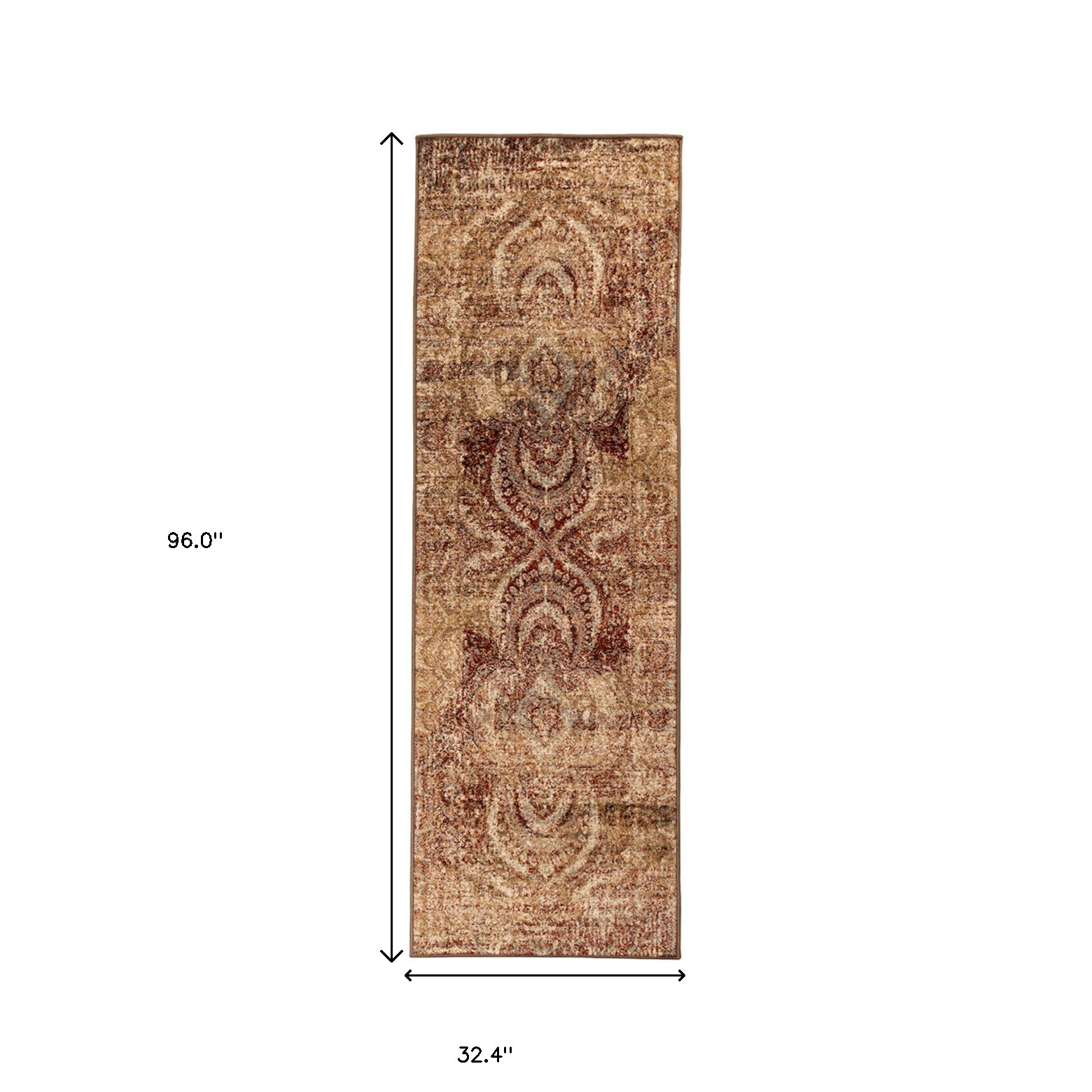 Add some artistry to your room with this 8-foot gold and maroon abstract distressed runner rug. Ideal for spaces with kids and pets, this rug is stain resistant to help repel dirt and spilled liquids. Built to last, this rug crafted from polypropylene fibers is known for its durability and long lasting appeal. Rugs are a great way to showcase your style, hide imperfections, warm your home and reduce noise. This transitional style runner makes a great accent for the hallway, in front of cabinets, in the laundry room, or any other space you need a narrow and long rug. 32.40-inch h x 96.00-inch w x 0.39-inch d.