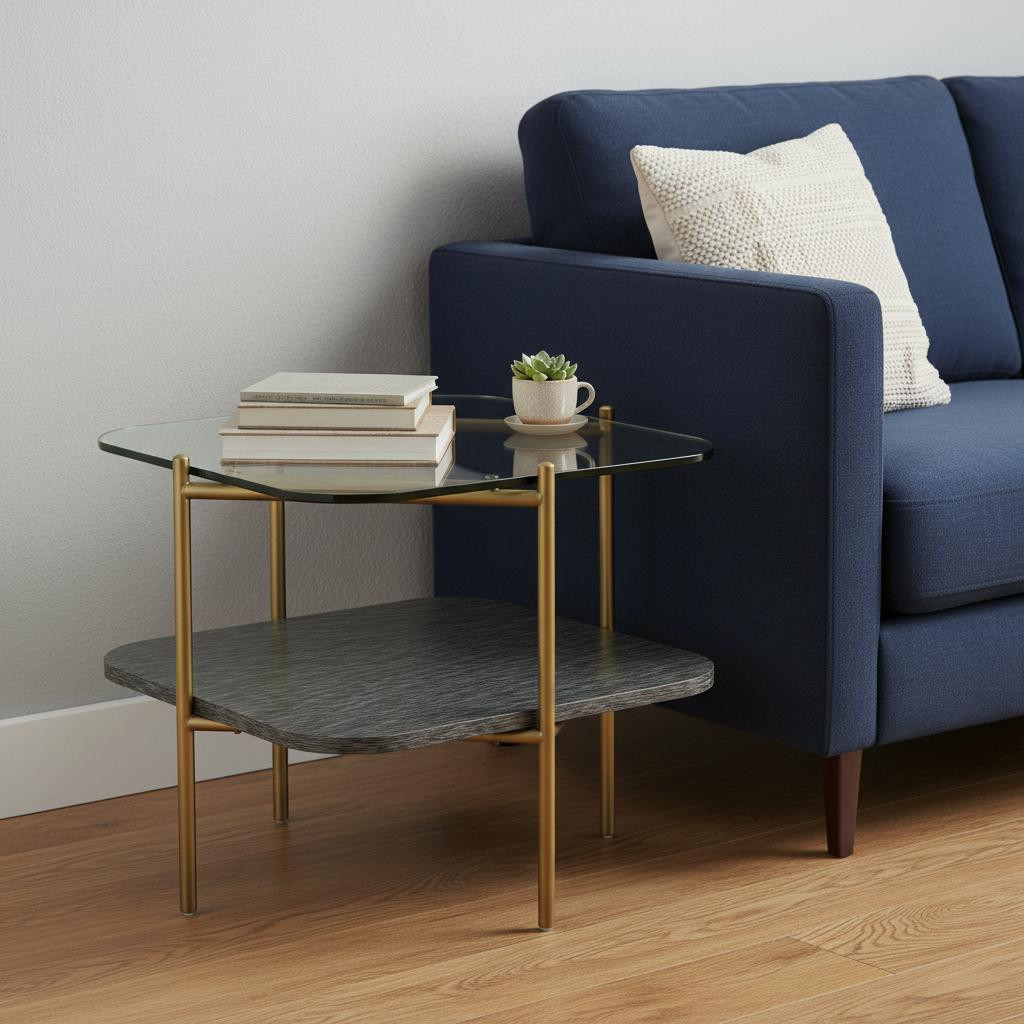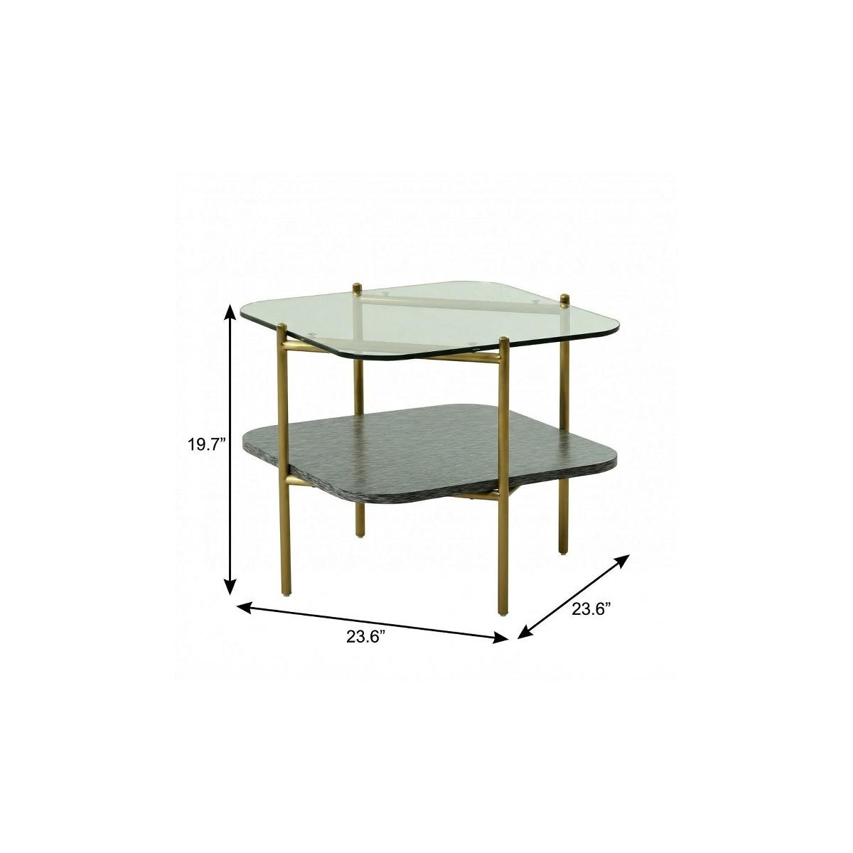 Distinctive in style the 20" gold and clear glass and metal square end table with shelf radiates a versatile charm. The gold coloration of the high quality metal base marries nicely with the clear glass top. Includes a single shelf for handy storage or display space. A great accent on either side of the sofa or bed, this adorable end or side table is just what you need. This versatile table is a great accent for most any room. 19.7" H x 23.6" W x 23.6" D