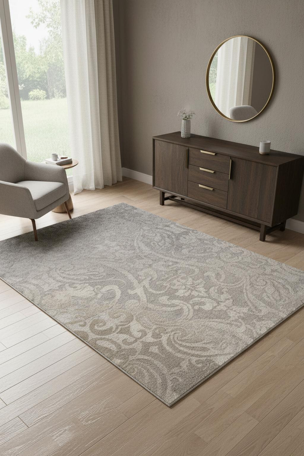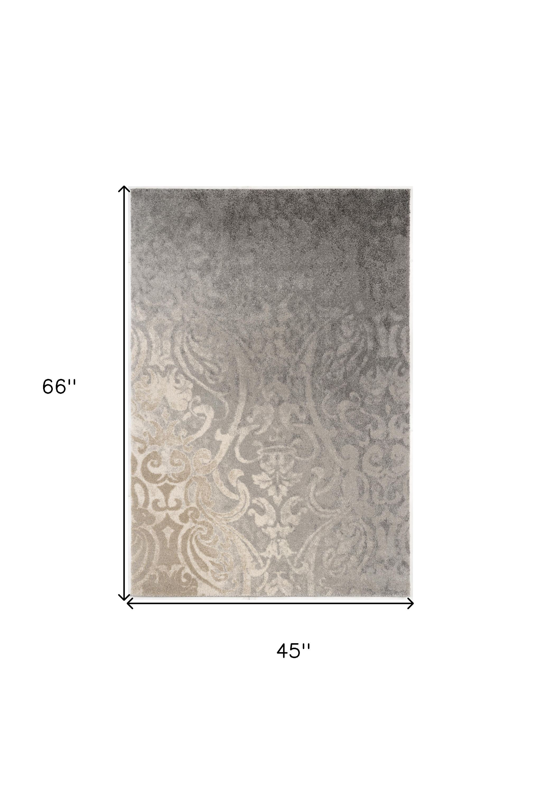 Set an inviting tone in your space with this 4-foot x 6-foot gray and ivory damask area rug. Ideal for spaces with kids and pets, this rug is stain resistant to help repel dirt and spilled liquids. Built to last, this rug crafted from polyester fibers is known for its durability and long lasting appeal. This smaller sized, modern styled rug is just what you need for your walkway, bedside, in front of door, cabinet, refrigerator, or chair. 45.00-inch h x 66.00-inch w x 0.75-inch d.