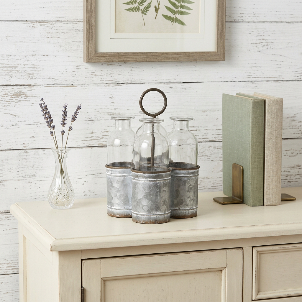 Unique and decorative, this set of four clear galvanized metal and glass decorative bottle tabletop sculpture will leave a lasting impression. This clear colored piece is made from high grade galvanized metal and glass. It's a perfect addition for those who love an up-to-the-minute look and feel. 8-inch h x 5.75-inch w x 5.75-inch d.