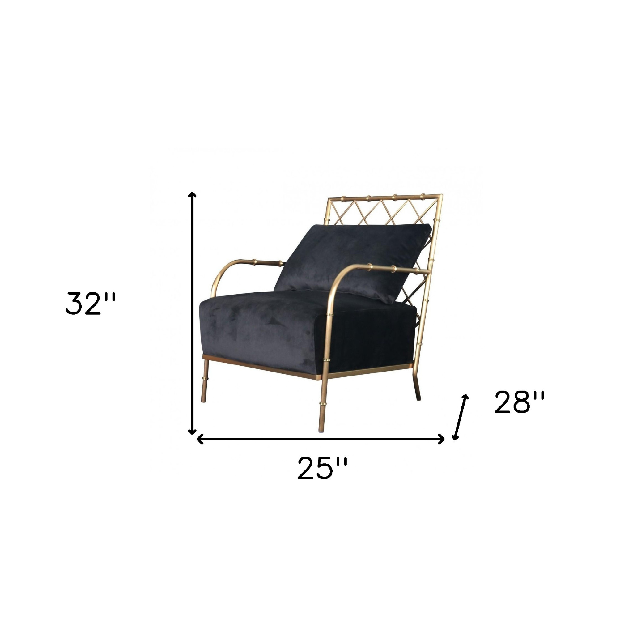 Add an air of fashion to your room and rejuvenate the space with this 25-inch black and gold velvet arm chair. This sturdy velvet upholstered arm chair comes in a chic solid black color to give your space just the right look. Giving the chair stability and structure, the inner frame is constructed with high quality stainless steel, includes comfy armrests, and features a cushion back that comes complete with soft and comfortable cushioning. 32-inch h x 25-inch w x 28-inch d.