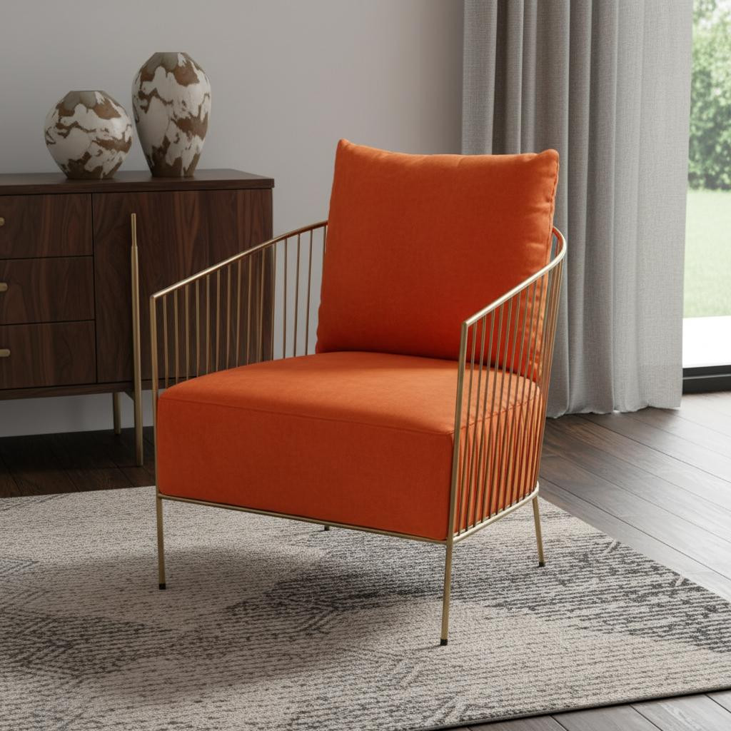 Stylish, elegant and fully functional, the 27-inch orange and gold velvet arm chair adds a touch of panache to any set up. Built to last this arm chair is finished in solid orange velvet to give your room a great update. Giving the chair stability and structure, the inner frame is constructed with high quality stainless steel, includes comfy armrests, and features a cushion back that comes complete with soft and comfortable cushioning. 31-inch h x 27-inch w x 30-inch d.
