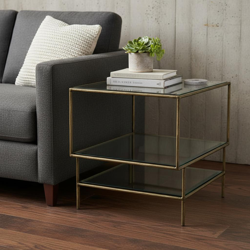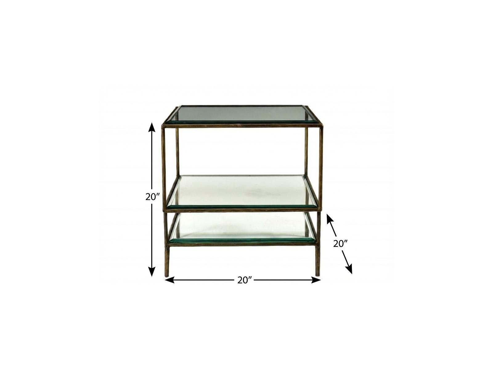 Optimize your space and add some charm to your room with the 20" bronze and clear glass and iron square end table with two shelves. The base of this table is made from iron in a bronze color that is a nice contrast to the clear glass tabletop. Includes two shelves for additional storage or display space. A great accent on either side of the sofa or bed, this adorable end or side table is just what you need. You can match it with other pieces to get the ideal look for your place. 20" H x 20" W x 20" D