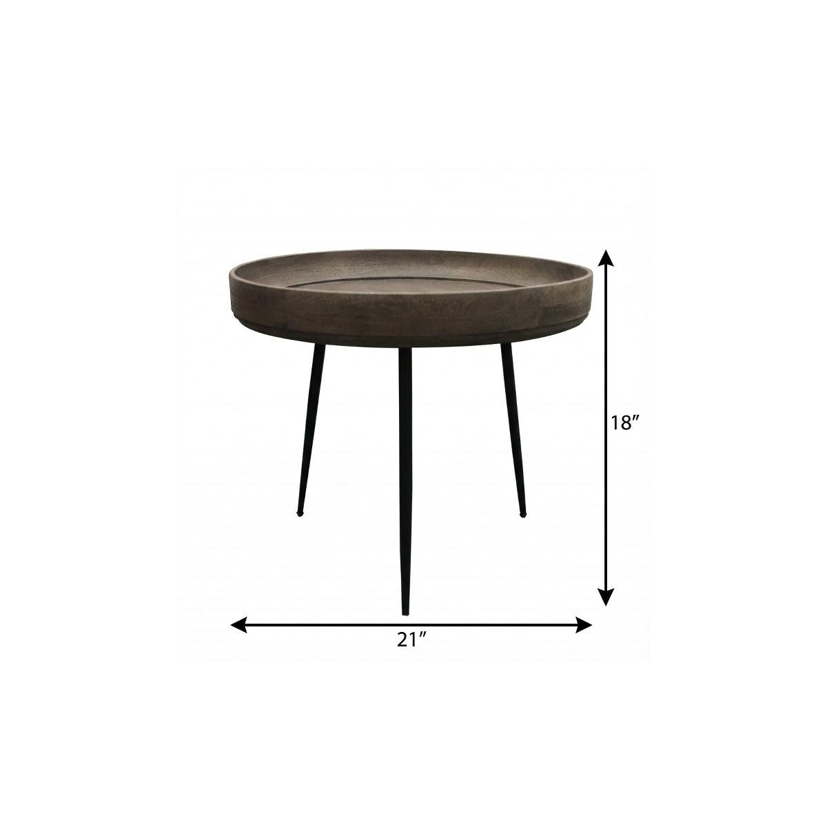 Optimize your space and add some charm to your room with the 18" black and gray solid wood and iron round end table. Quality construction from the black iron base combines with gray solid wood of the top to give this table a fresh and updated look. Complete with a purposefully distressed finish, this table has an aged, vintage, and rustic feel. An ideal location for placing your snacks and drinks, and a place to keep your lamp, frames, or other accessories. You can match it with other pieces to get the ideal look for your place. 18" H x 21" W x 21" D