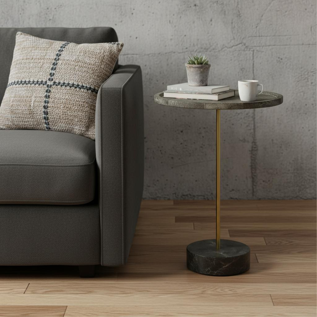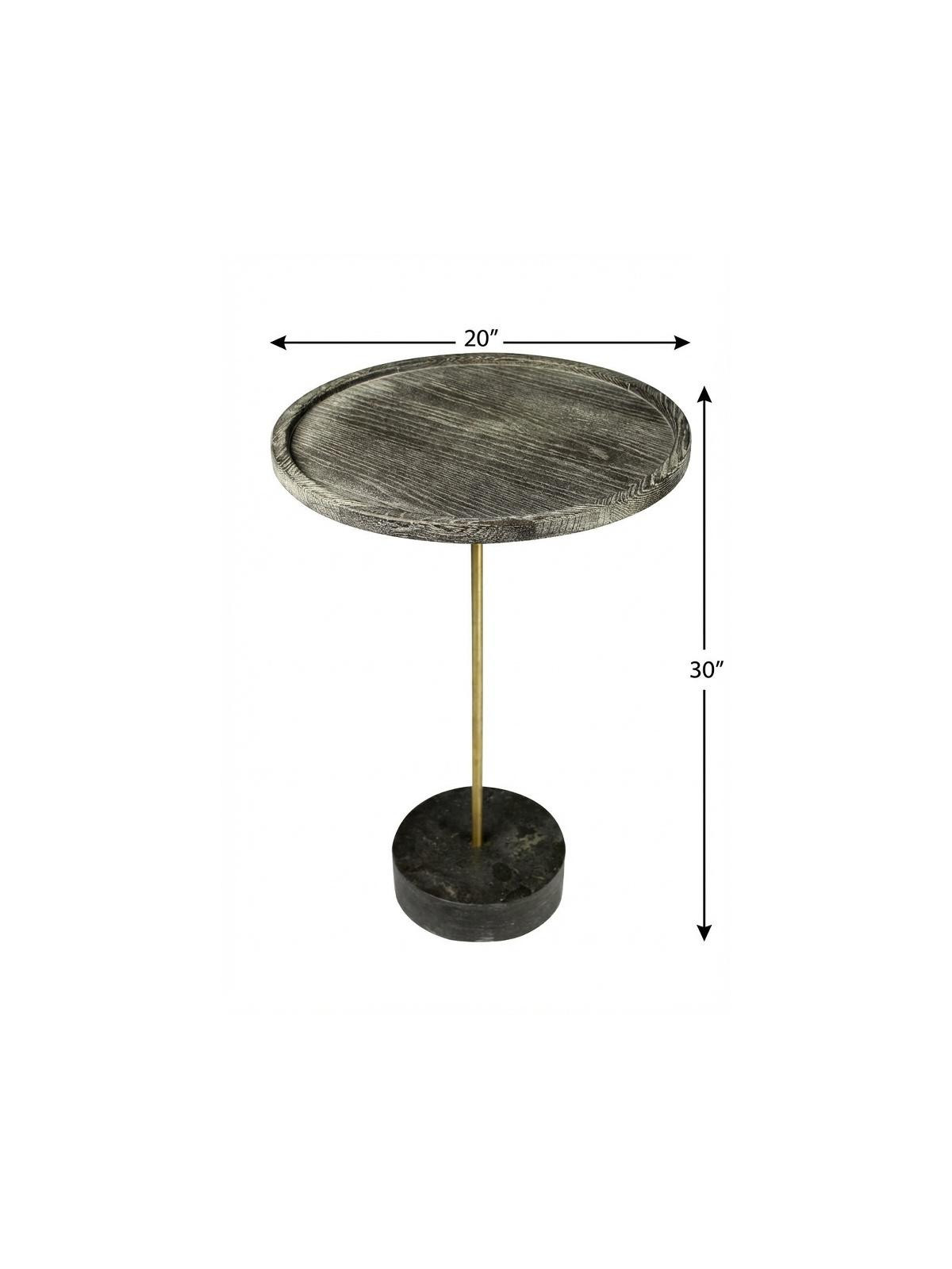Show off your exquisite taste with this 30" black and brown solid wood and 100% marble round end table. A black 100% marble frame is finished off with a brown solid wood top that is the epitome of quality construction and design. Complete with a purposefully distressed finish, this table has an aged, vintage, and rustic feel. A great accent on either side of the sofa or bed, this adorable end or side table is just what you need. This versatile table is a great accent for most any room. 30" H x 20" W x 20" D