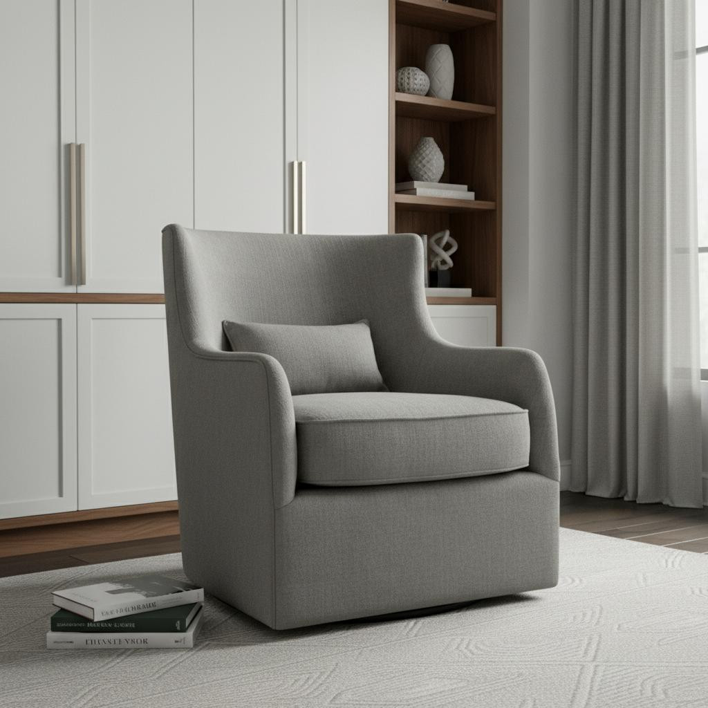 This 30" gray polyester blend solid color swivel arm chair is the perfect decorative yet functional accessory for your home. This sturdy polyester blend upholstered arm chair comes in a chic solid gray color to give your space just the right look. The sturdy inner frame is built with high quality manufactured wood, includes armrests, and features a tight back that is accented with soft and comfortable cushioning. This chair features a swivel function so that you can turn and angle easily to interact with your space. 37" H x 30" W x 25" D