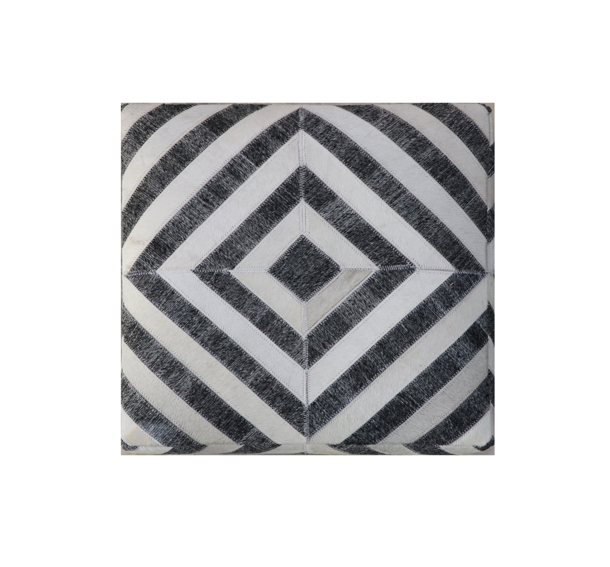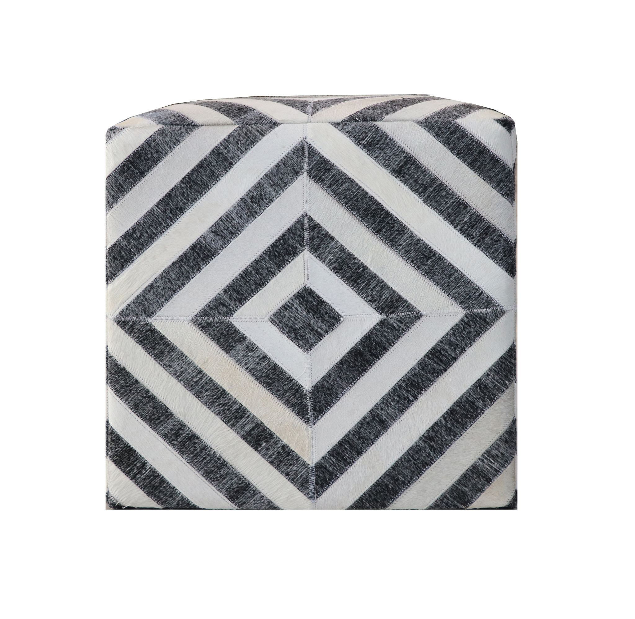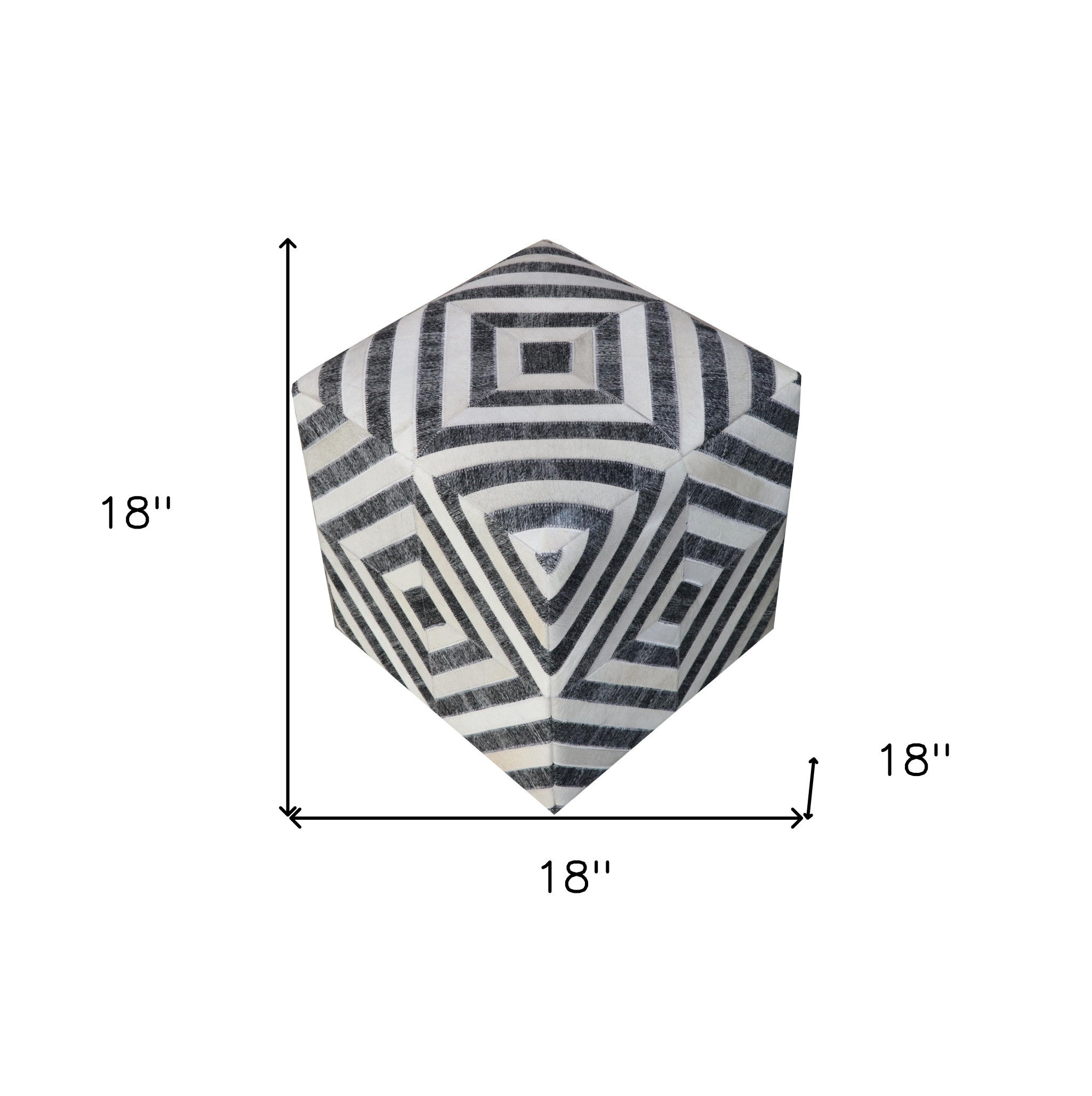 Practicality and fashion mix together with this handy 18-inch dark gray and ivory hair on hide cube geometric pouf ottoman. Add chic style to your space with this fun pouf that not only looks cool but can be a great foot rest or extra seat when needed. Expertly upholstered with padding and soft hair on hide in a geometric pattern, this ottoman is as comfortable as it is good looking. Ottomans are multi-functional additions to your space that add fashion and practical value. 18-inch H x 18-inch W x 18-inch D