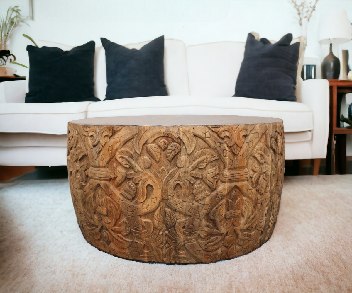 This stylish 32-inch white and natural iron and solid wood round drum coffee table is not only practical, but good looking and built to last. The base of this table is made from solid wood in a natural color that creates a good looking visual contrast to the white iron tabletop. This round table utilizes its unique shape to give your room a modern geometric accent. If you're looking for something that can fit into a living area, bedroom, or office, this coffee table is for you. 17-inch h x 32-inch w x 32-inch d.