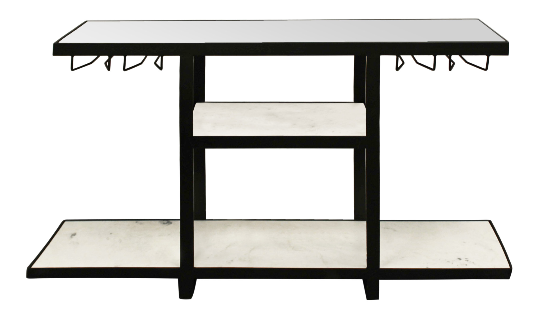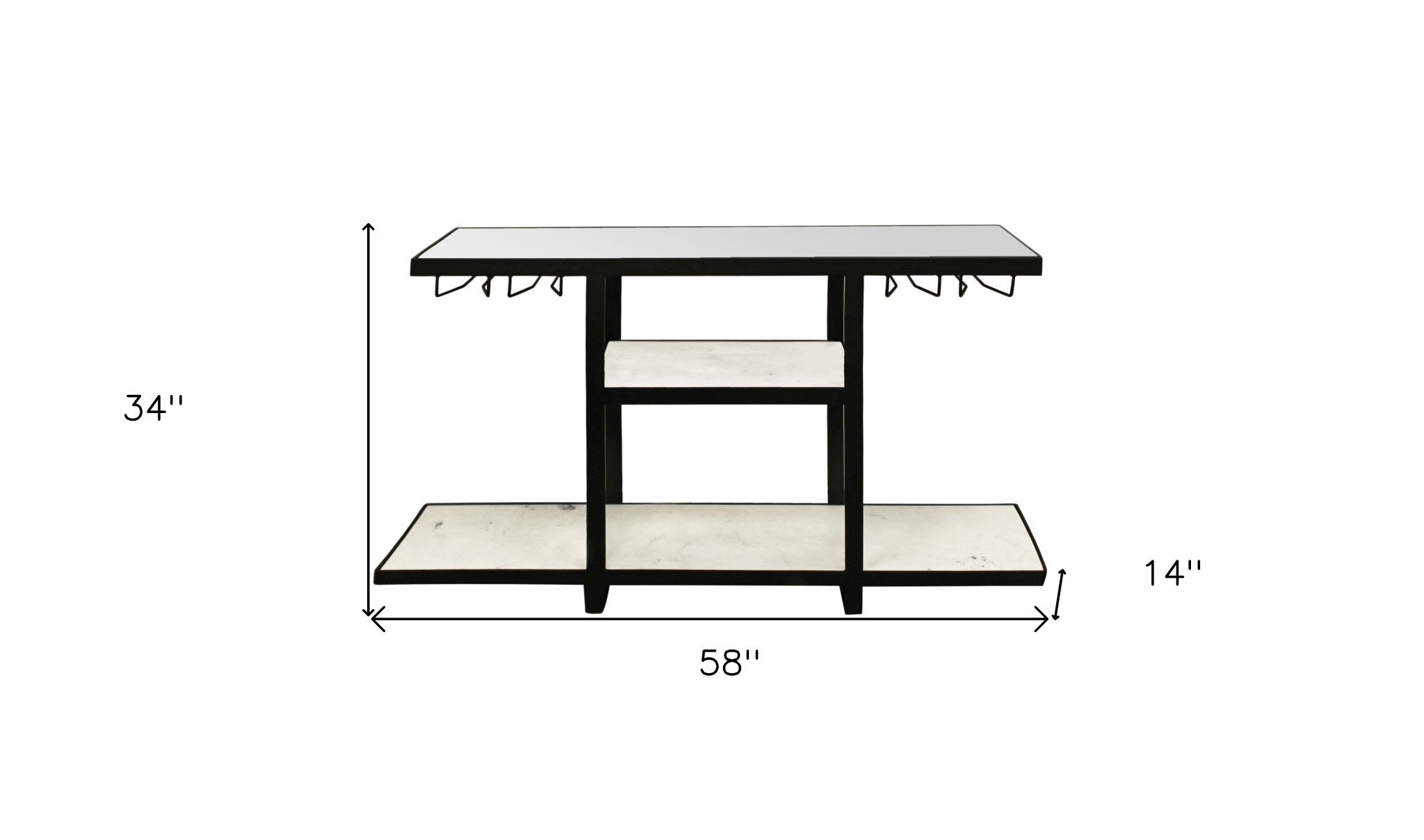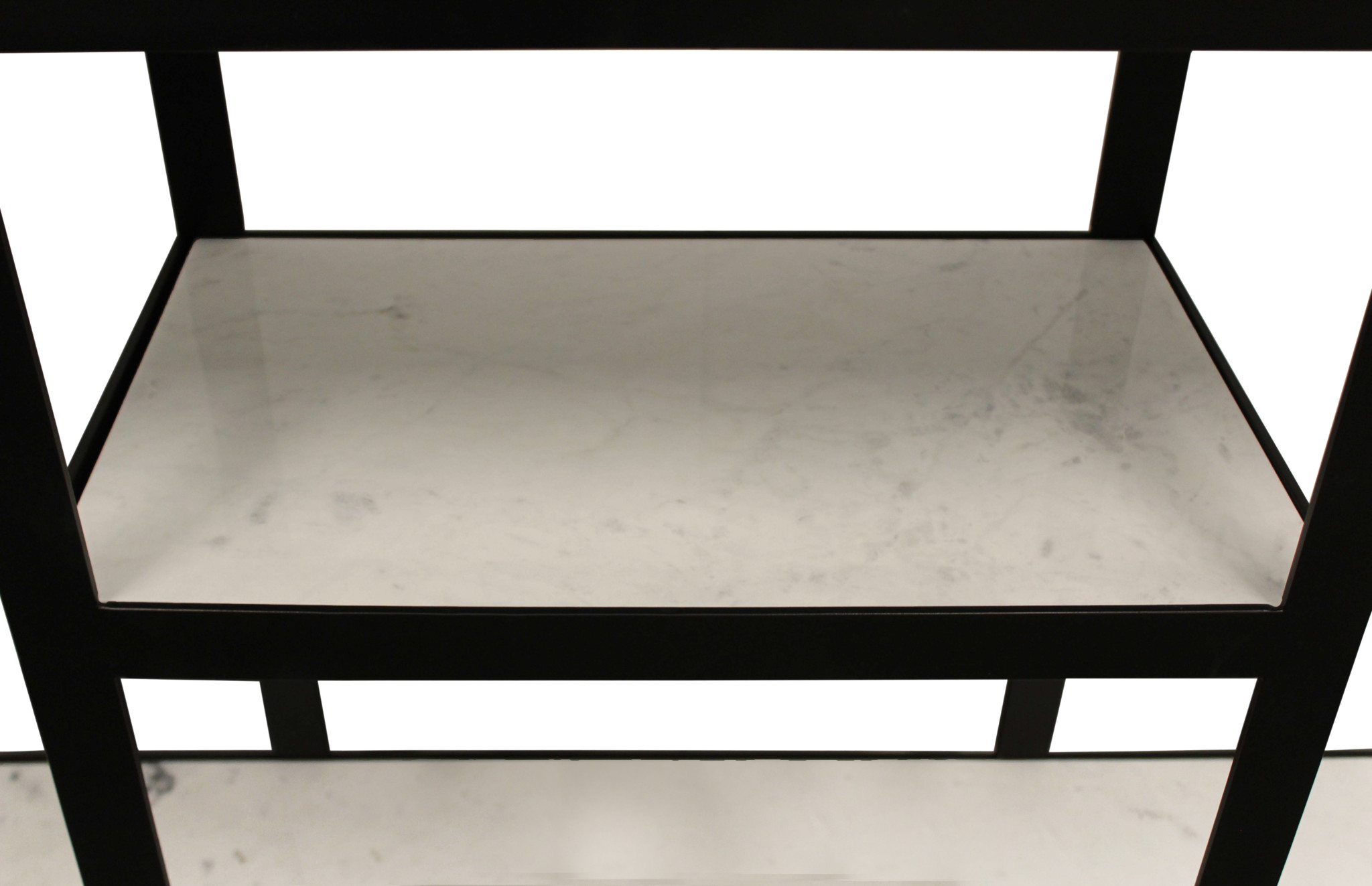 This 58-inch white and black genuine marble floor shelf console table two shelves is a high-quality, long-lasting piece of furniture that you can enjoy for years to come. This versatile table is a classic rectangular shape, which will easily fit into most any space in your home. This console table features a secure and solid white, genuine marble top. The floor shelf is made of durable, solid metal. Ideal for living rooms, bedrooms, home offices, and lounge areas, this console table is not only good looking but multi-functional and practical addition to your space. 34-inch h x 58-inch w x 14-inch d.