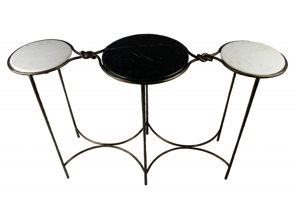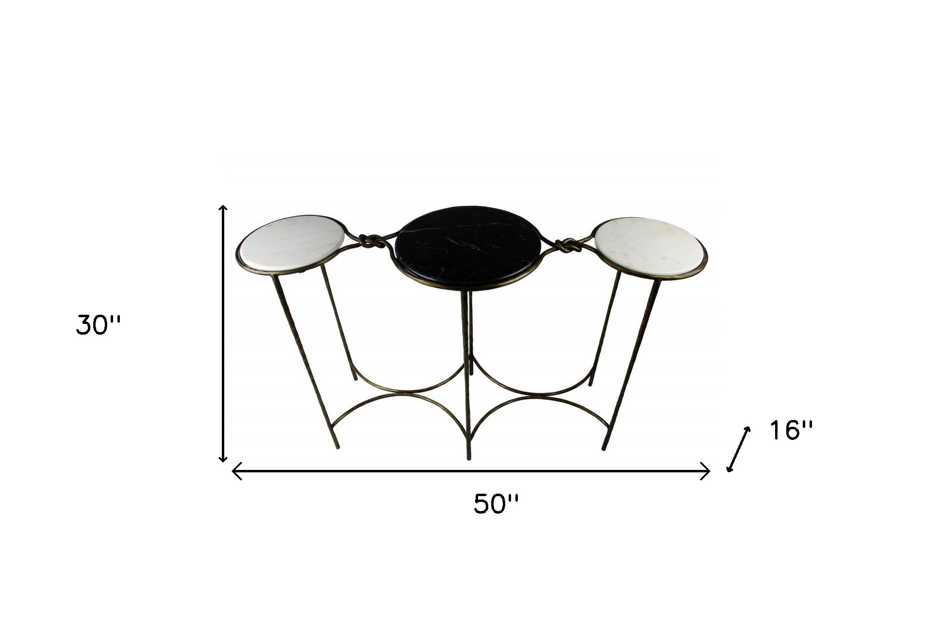 Our 50-inch black white and gold genuine marble round six leg console table a great addition to any room, serving as a stylish and decorative element. The round shape of this table will soften the flow of any room. The black and white top of this genuine marble table will add beauty to any room with its alluring and distinctive veining of the stone. In addition to a great top, our console table has a iron six leg base, meaning that it is well-built and secure. Versatile in use, console tables can be used for a variety of purposes in a variety of rooms and settings. 30-inch h x 50-inch w x 16-inch d.