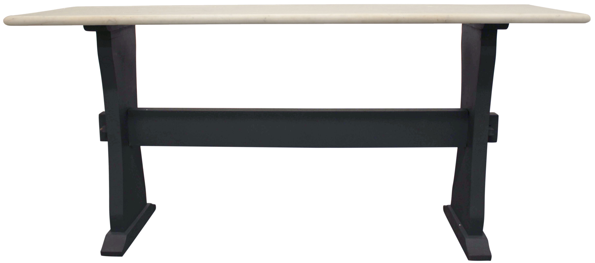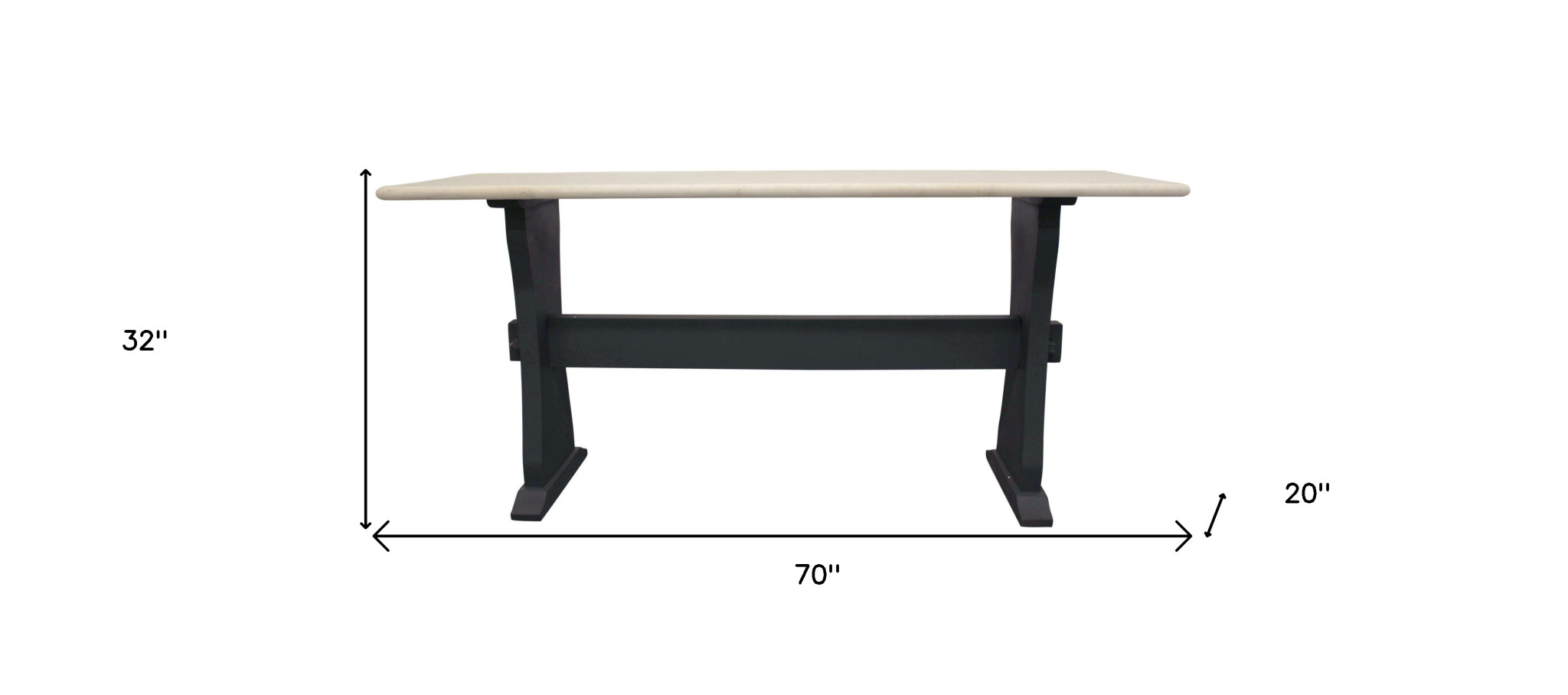 This 70-inch ivory and black genuine marble trestle console table can provide a variety of practical functions such as providing extra storage space, serving as a display area for decorative items or acting as a catch-all for keys, mail, and other small items. This versatile table is a classic rectangular shape, which will easily fit into most any space in your home. The ivory top of this genuine marble table will add beauty to any room with its alluring and distinctive veining of the stone. The trestle of this unit is crafted with solid wood, leaving you with a console table that is of the finest quality and materials. Versatile in use, console tables can be used for a variety of purposes in a variety of rooms and settings. 32-inch H x 70-inch W x 20-inch D
