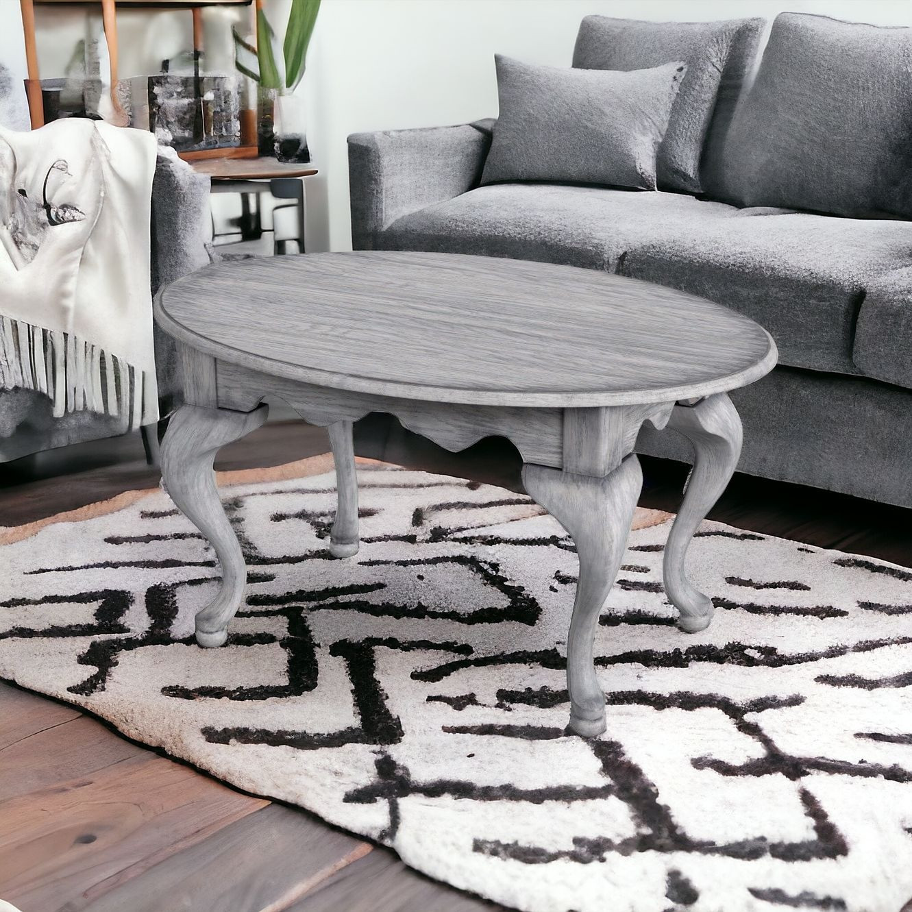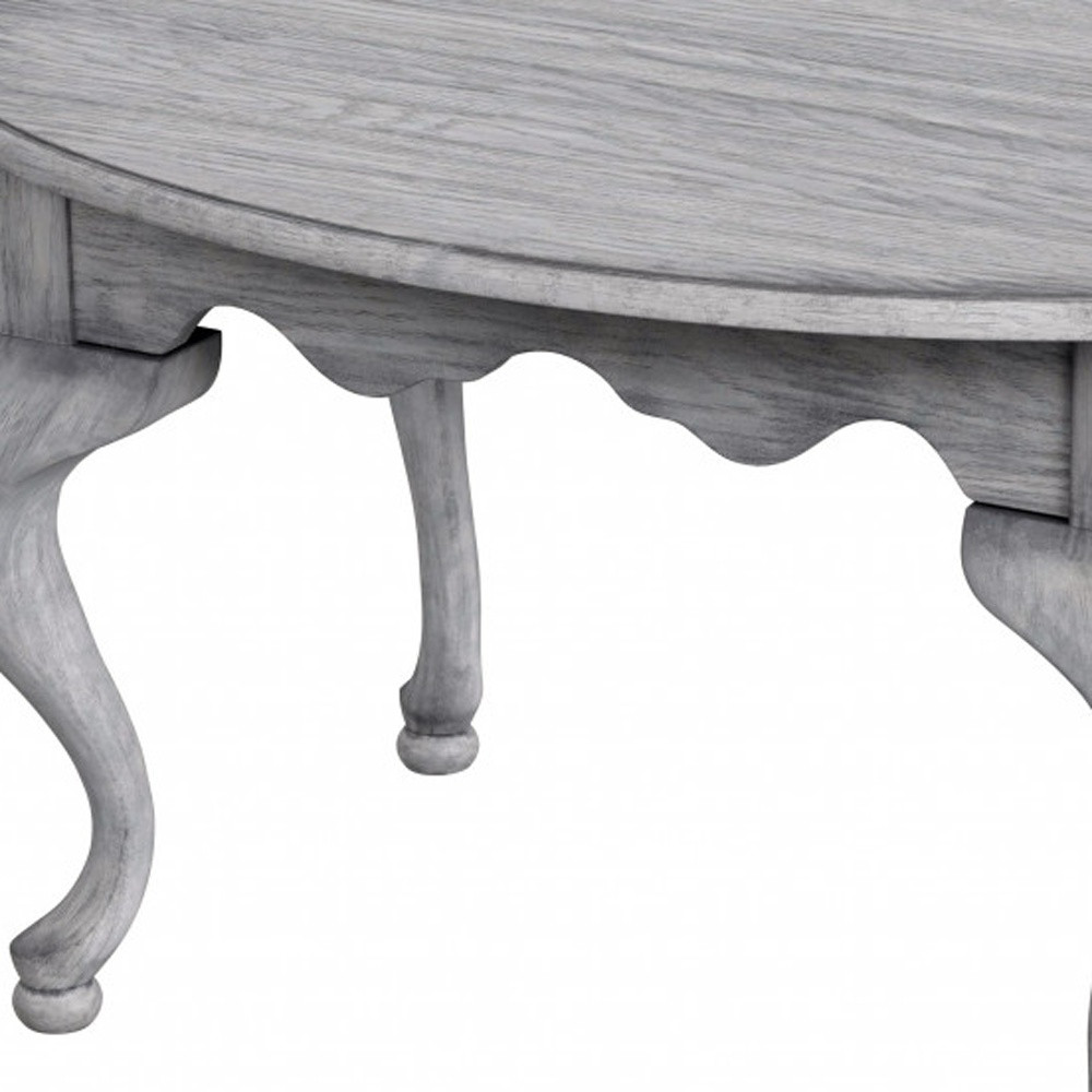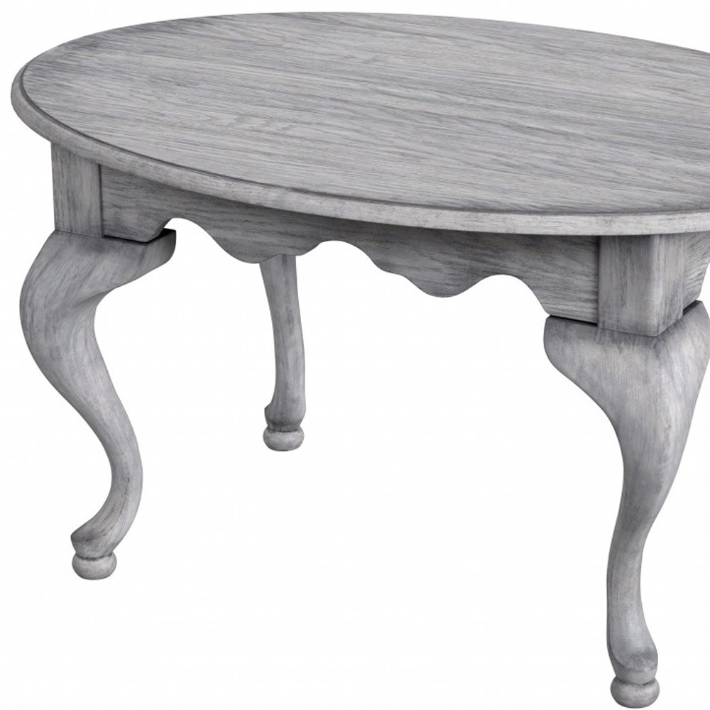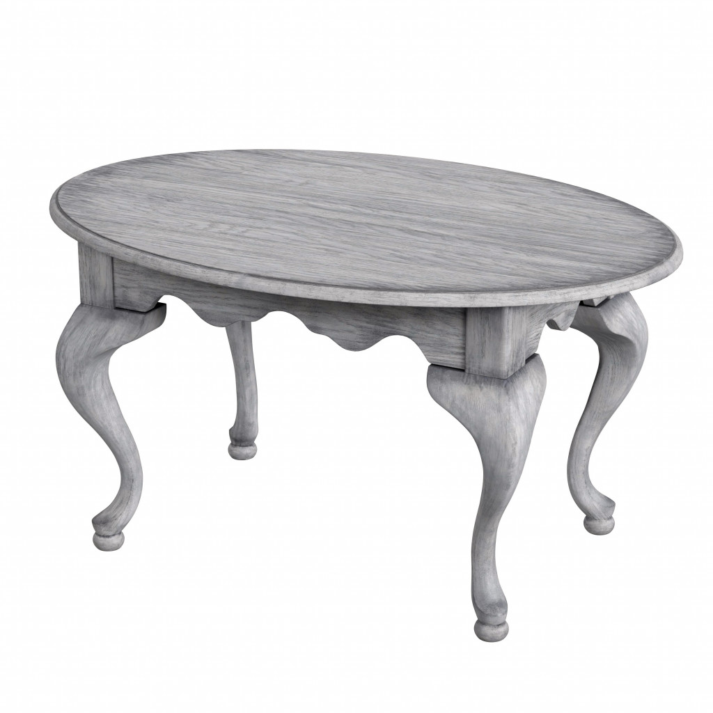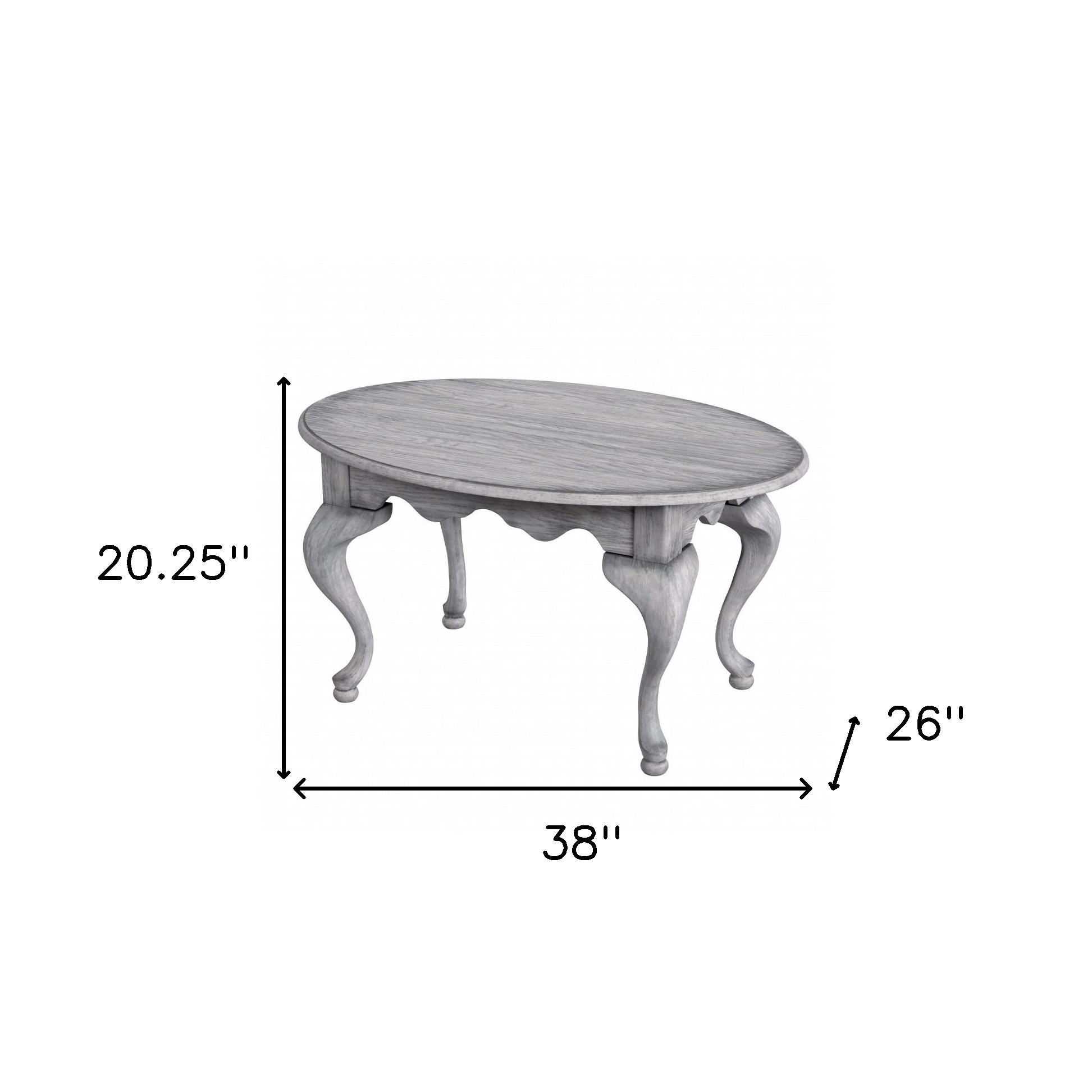 Make your living room or family room really stand out with this 38-inch gray solid and manufactured wood oval distressed coffee table. Create an inspiring atmosphere in most any room with this gray solid and manufactured wood table. Complete with a purposefully distressed finish, this table has an aged, vintage, and rustic feel. This oval table is an updated take on a classic. Queen anne legs are a sign of high quality and classic construction. If you're looking for something that can fit into a living area, bedroom, or office, this coffee table is for you. This coffee table is the sturdy, reliable and stylish answer to your living room needs. 20.25-inch H x 38-inch W x 26-inch D