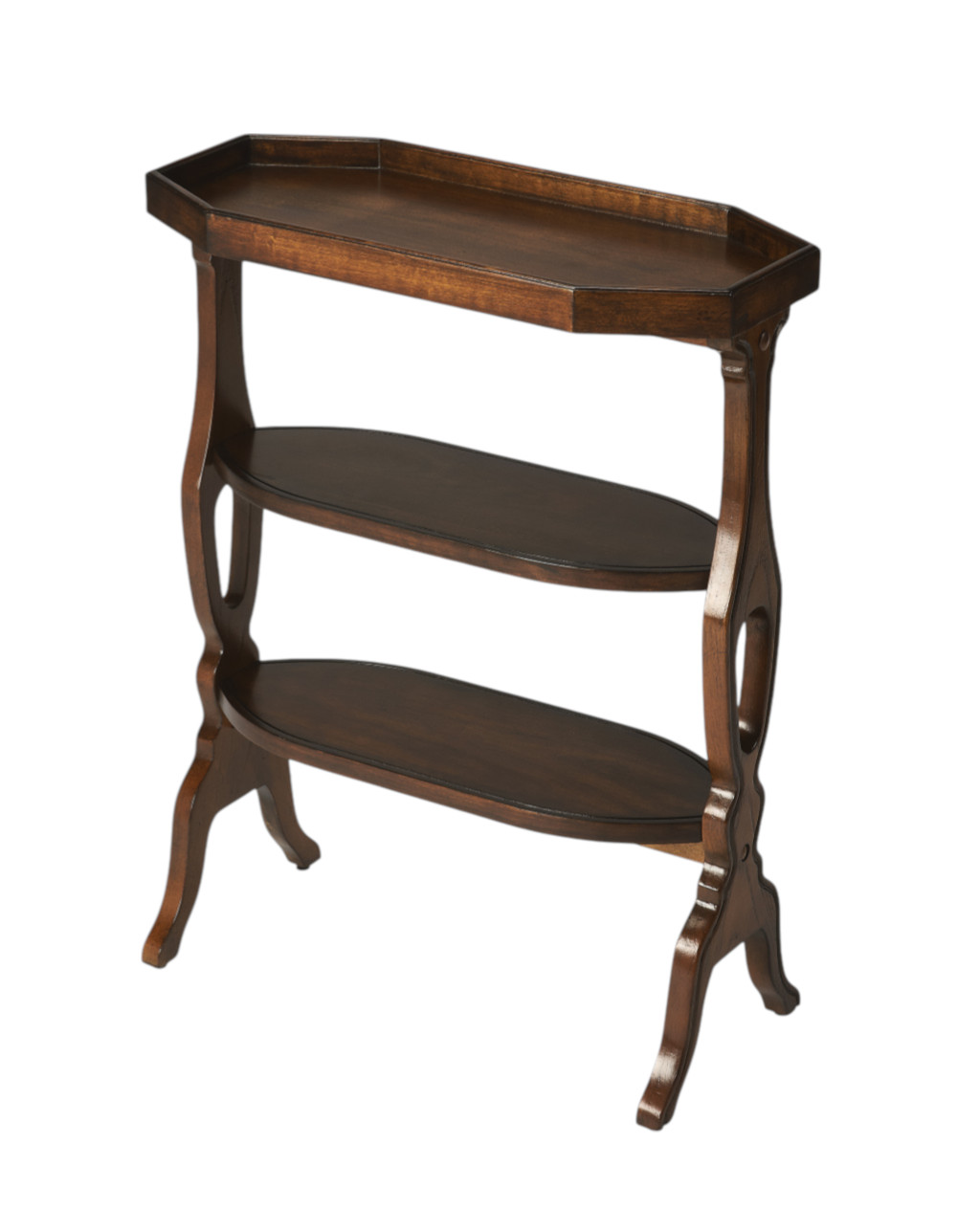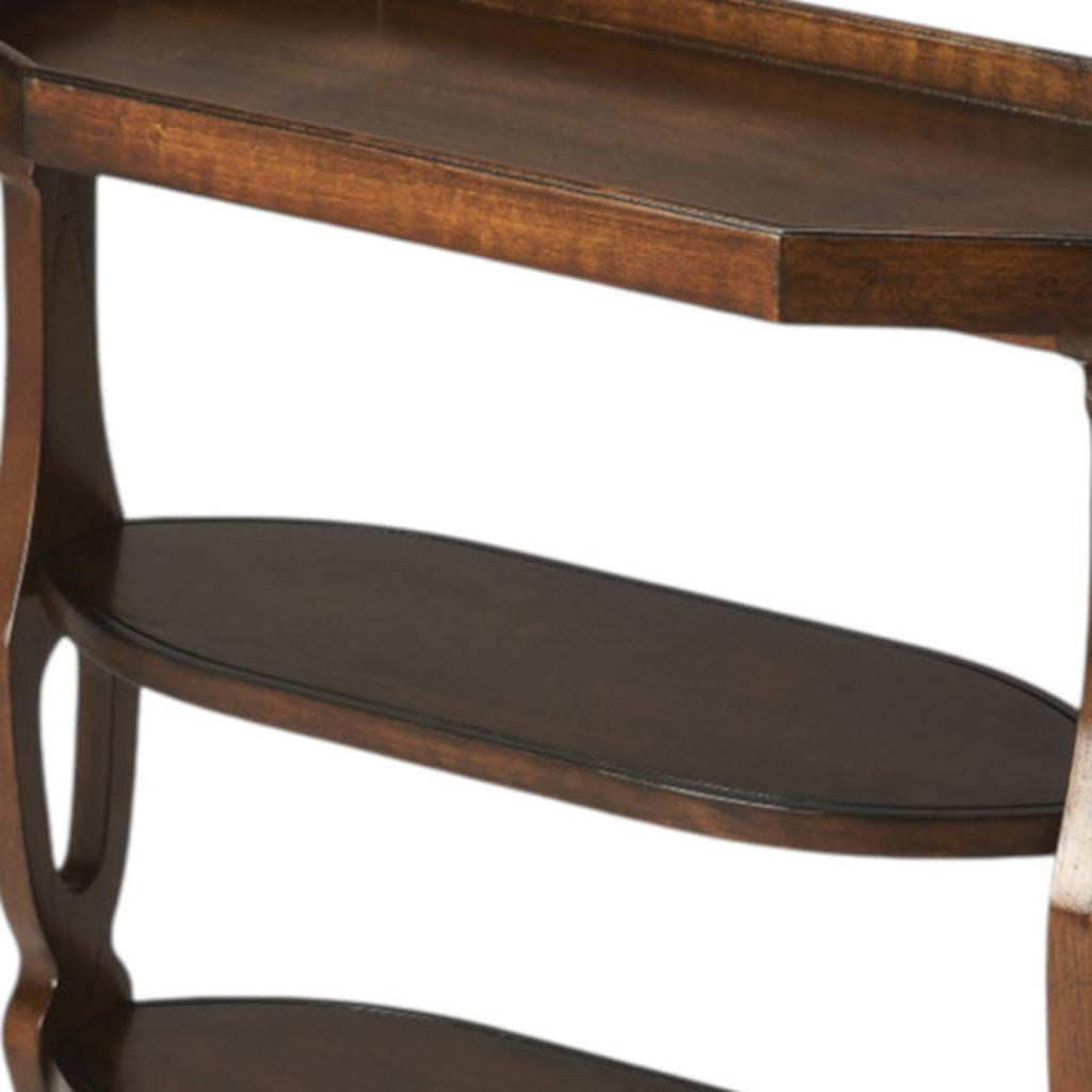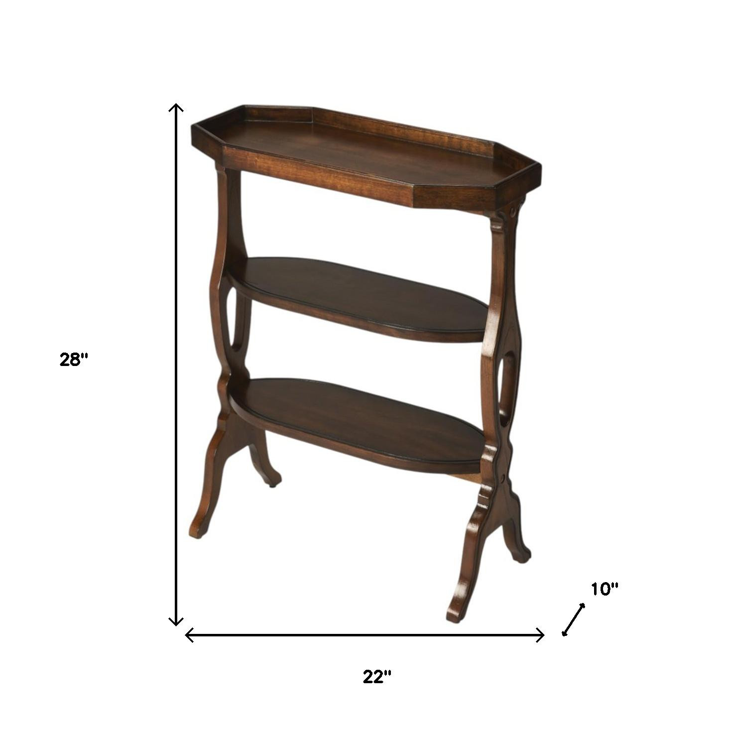Distinctive in style the 28" dark brown manufactured wood octagon end table with two shelves radiates a versatile charm. The dark brown coloration runs throughout this good looking solid and manufactured wood and manufactured wood table. The purposefully distressed finish gives this table an authentically rustic feel. There are 2 shelves that will help to keep clutter at bay. Side tables are a great way to flank your sofa, use as an accent next to your favorite chair, or can even be used bedside. You can match it with other pieces to get the ideal look for your place. 28" H x 22" W x 10" D