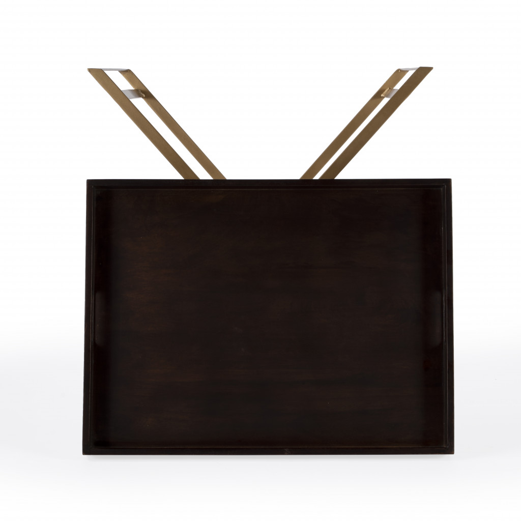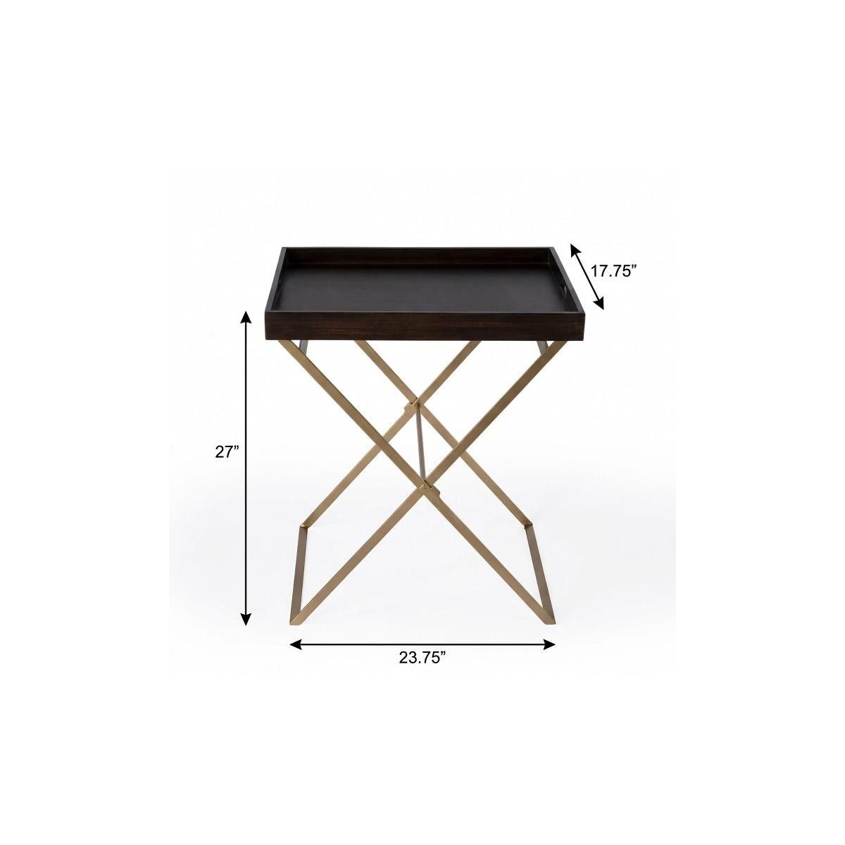 Show off your exquisite taste with this 27" gold and walnut solid wood rectangular end table. The walnut solid wood top of this table is a nice contrast to the high quality, gold iron of the base. The purposefully distressed finish gives this table an authentically rustic feel. A great accent on either side of the sofa or bed, this adorable end or side table is just what you need. This versatile table is a great accent for most any room. 27" H x 23.75" W x 17.75" D
