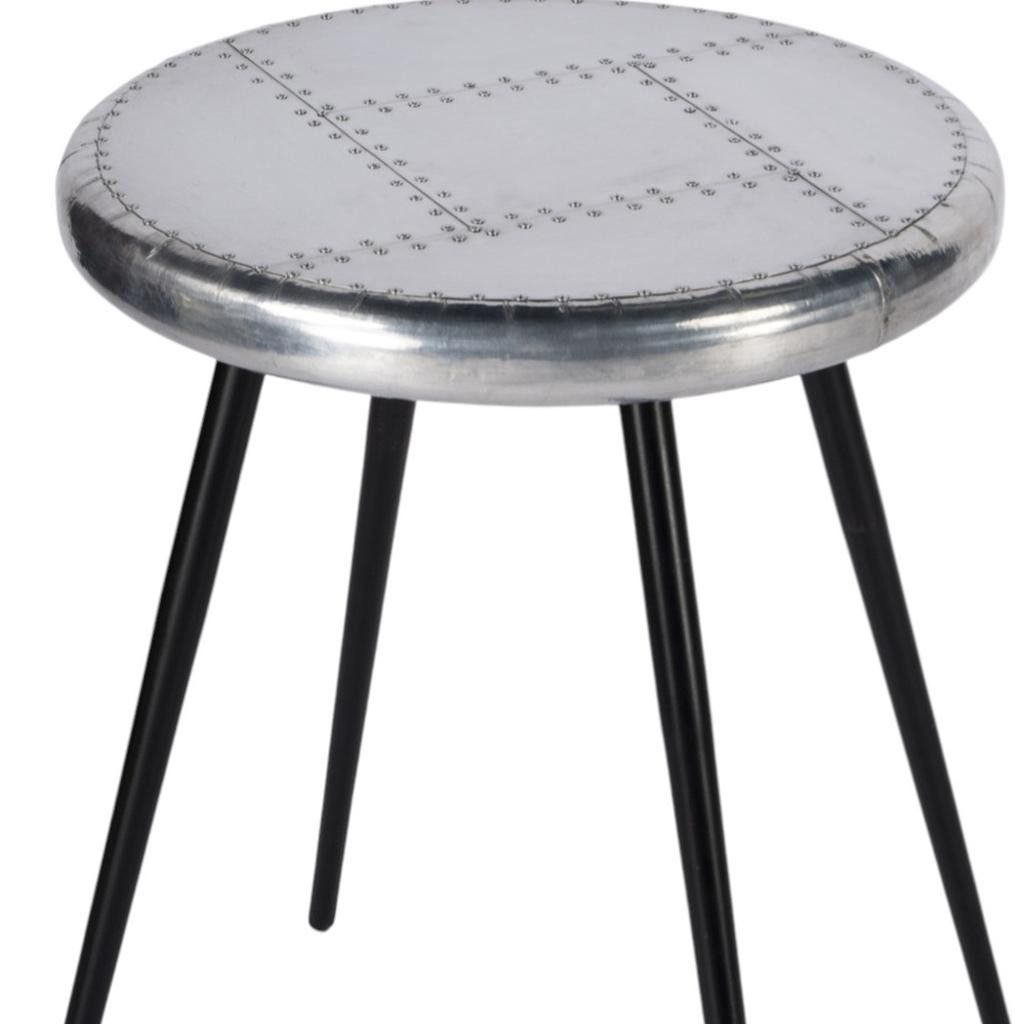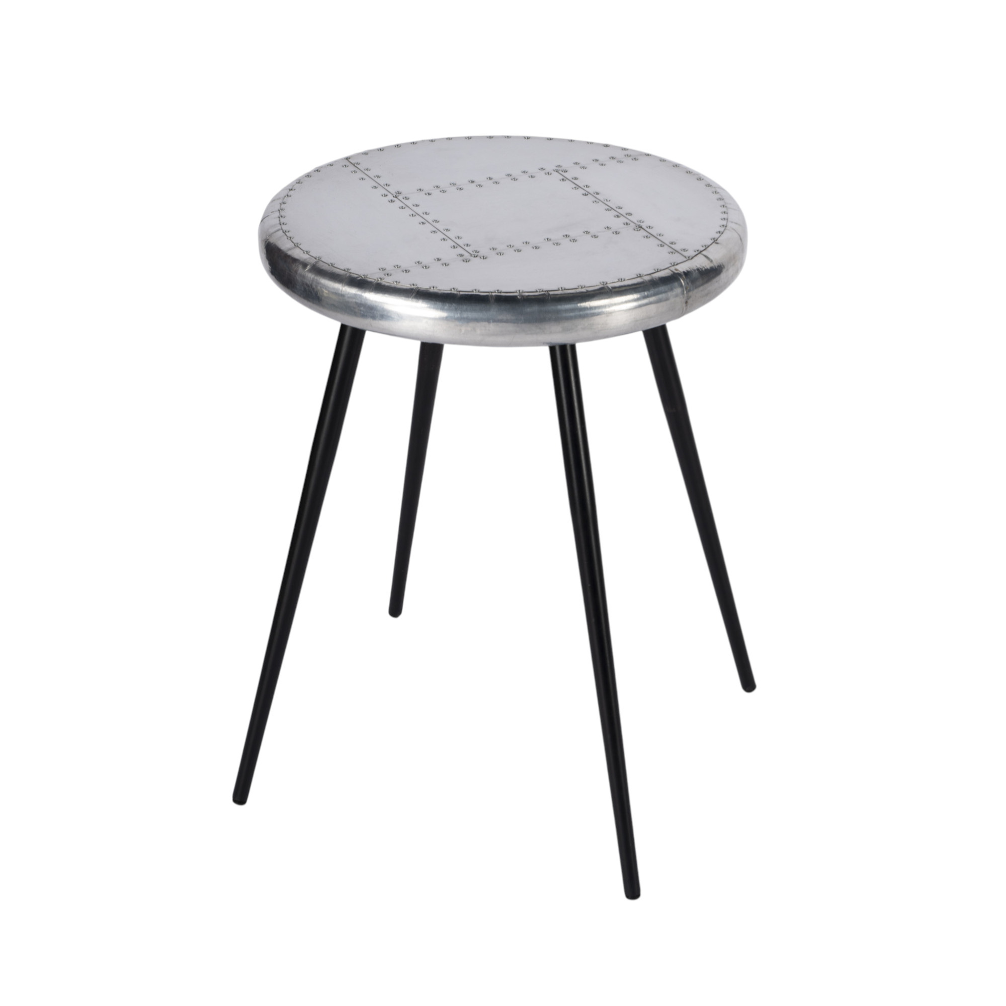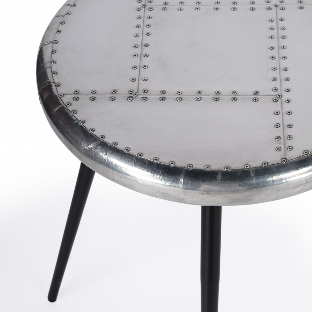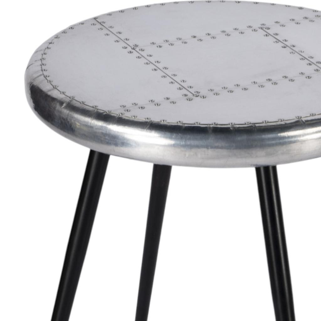 Distinctive in style the 23" silver manufactured wood round end table radiates a versatile charm. A solid silver iron frame is finished off with a matching aluminum sheeting over manufactured wood seat, giving this table a chic monotone look with a unique patchwork design. The purposefully distressed finish gives this table an authentically rustic feel. An ideal location for placing your snacks and drinks, and a place to keep your lamp, frames, or other accessories. You can match it with other pieces to get the ideal look for your place. 23.25" H x 18" W x 18" D