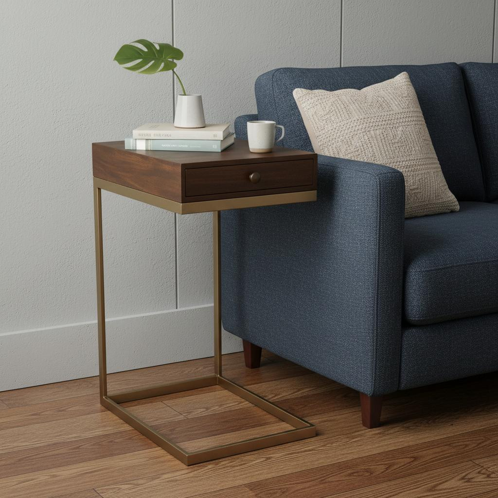 Distinctive in style the 27" natural brown solid and manufactured wood square end table with drawer radiates a versatile charm. A solid natural brown iron frame is finished off with a matching natural brown solid and manufactured wood seat, giving this table a chic monotone look. The purposefully distressed finish gives this table an authentically rustic feel. Includes a single easy pull out drawer for handy storage of life's little essentials. A great accent on either side of the sofa or bed, this adorable end or side table is just what you need. This versatile table is a great accent for most any room. 27.25" H x 13.75" W x 17.75" D