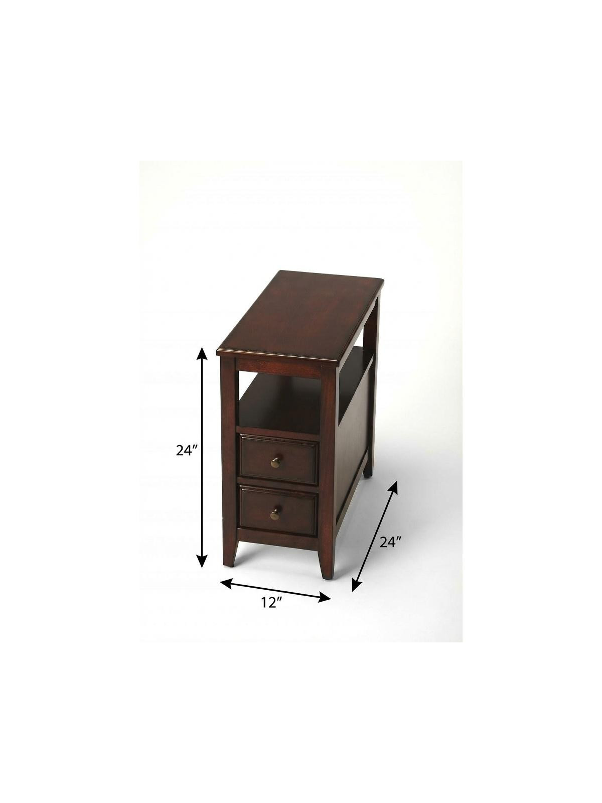 Distinctive in style the 24" dark brown manufactured wood end table with two drawers and shelf radiates a versatile charm. A solid dark brown solid and manufactured wood frame is finished off with a matching dark brown manufactured wood seat, giving this table a chic monotone look. Complete with a purposefully distressed finish, this table has an aged, vintage, and rustic feel. Includes a single shelf for handy storage or display space. Includes 2 easy open drawers for storage of the small essentials. An ideal location for placing your snacks and drinks, and a place to keep your lamp, frames, or other accessories. You can also use it as an entryway table to hold your keys. 24" H x 12" W x 24" D