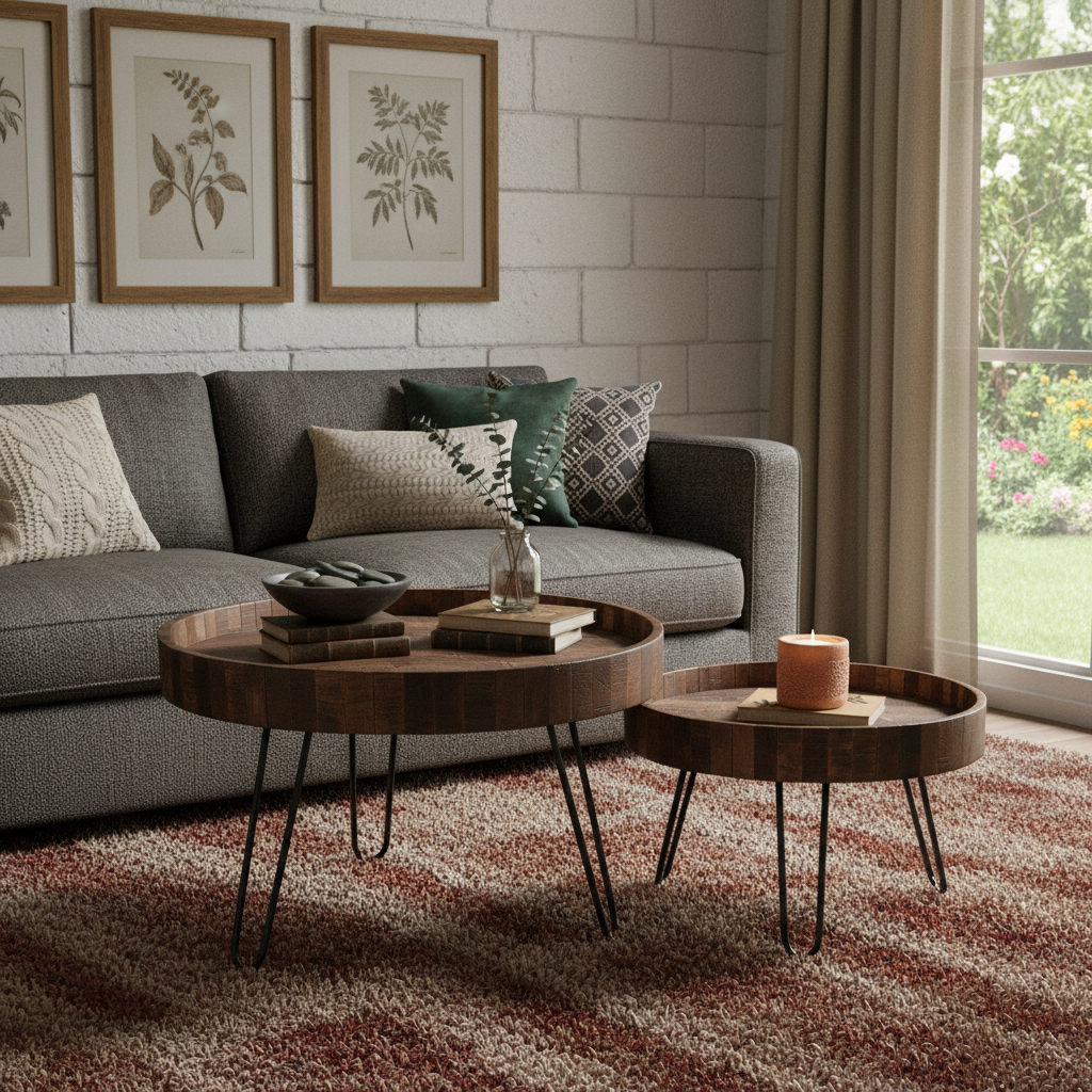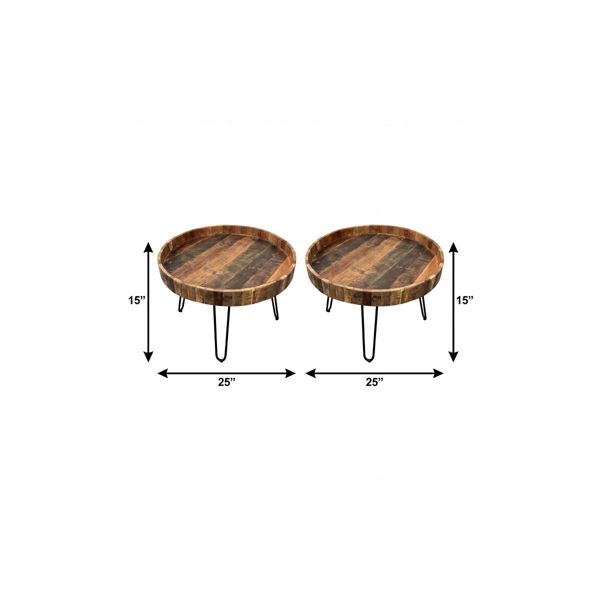 Increase your decorating options with this set of two 15" black and natural brown solid wood and iron round end tables that will enhance your space. This pair makes the ideal companion for flanking the sofa or bed and can be used together or separately as you choose. A black iron frame is finished off with a natural brown solid wood top that is the epitome of quality construction and design. Complete with a purposefully distressed finish, this table has an aged, vintage, and rustic feel. Side tables are a great way to flank your sofa, use as an accent next to your favorite chair, or can even be used bedside. You can match it with other pieces to get the ideal look for your place. 15" H x 25" W x 25" D