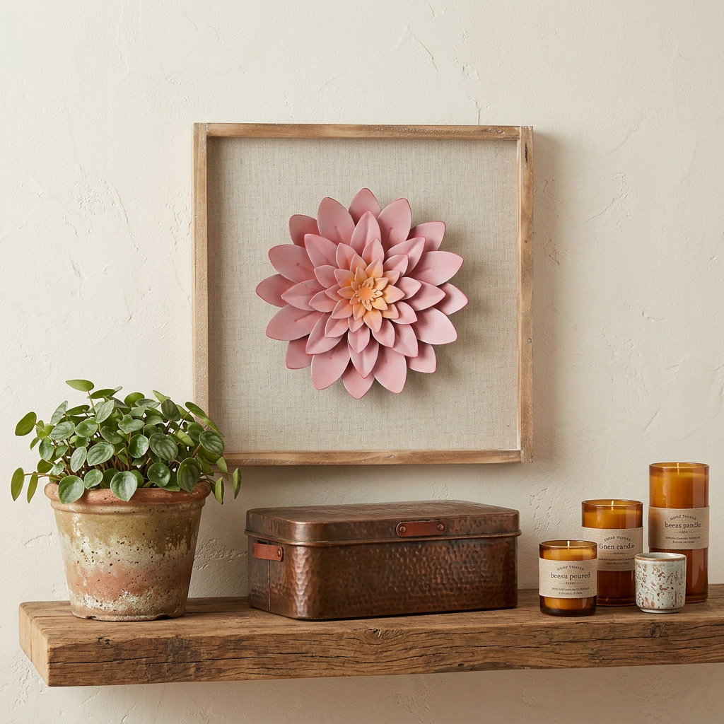 Bring some sizzle to your space with this eye-catching 12-inch x 13-inch pink and off white flower wood and metal wall decor. Handmade with care, this piece brings some authenticity to your space. With materials and a finish that is purposefully distressed, this hanging wall decor will instantly liven things up and bring color and dimension to your walls. This wall art will bring a pretty floral look to your space. 12.25-inch H x 12.5-inch W x 1.25-inch D