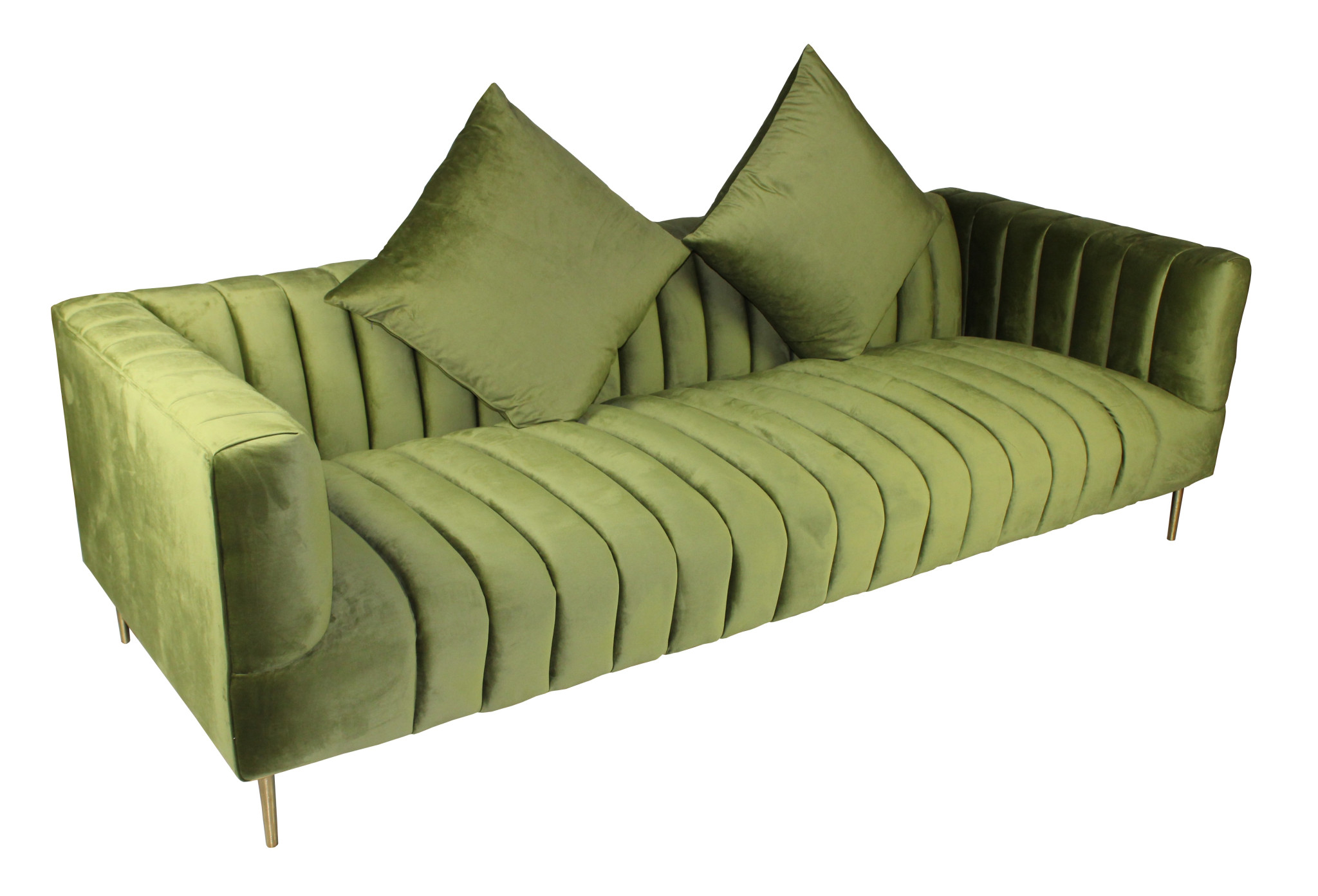 Add an air of fashion to your space with this fabulous 90-inch olive green velvet sofa and toss pillows with gold legs. With a warm and rich look to it, this solid color standard is upholstered in velvet that is designed to be super soft to the touch, sturdy and resilient. Solid colors give you lots of decorative options and are easy to work into your decor scheme. Sinuous springs construction gives this piece strong support and makes it comfortable to sit even for long periods of time. Round arms offer a comfy place to rest. Gold metal legs effortlessly elevate the room and add a touch of contemporary design. A great showpiece for your room, this sofa is a must have. 28-inch H x 90-inch W x 37-inch D