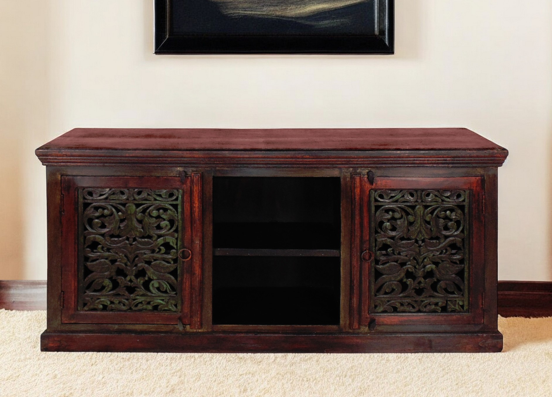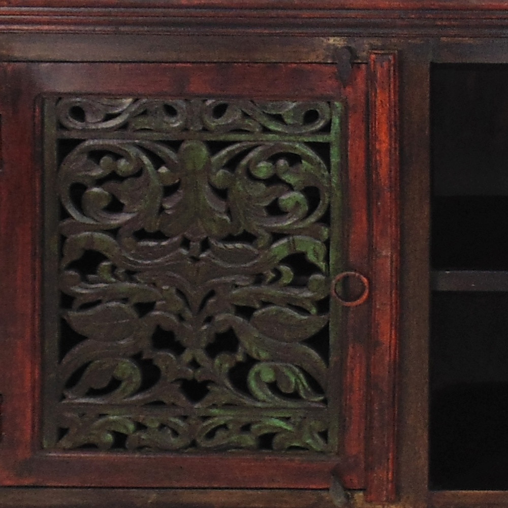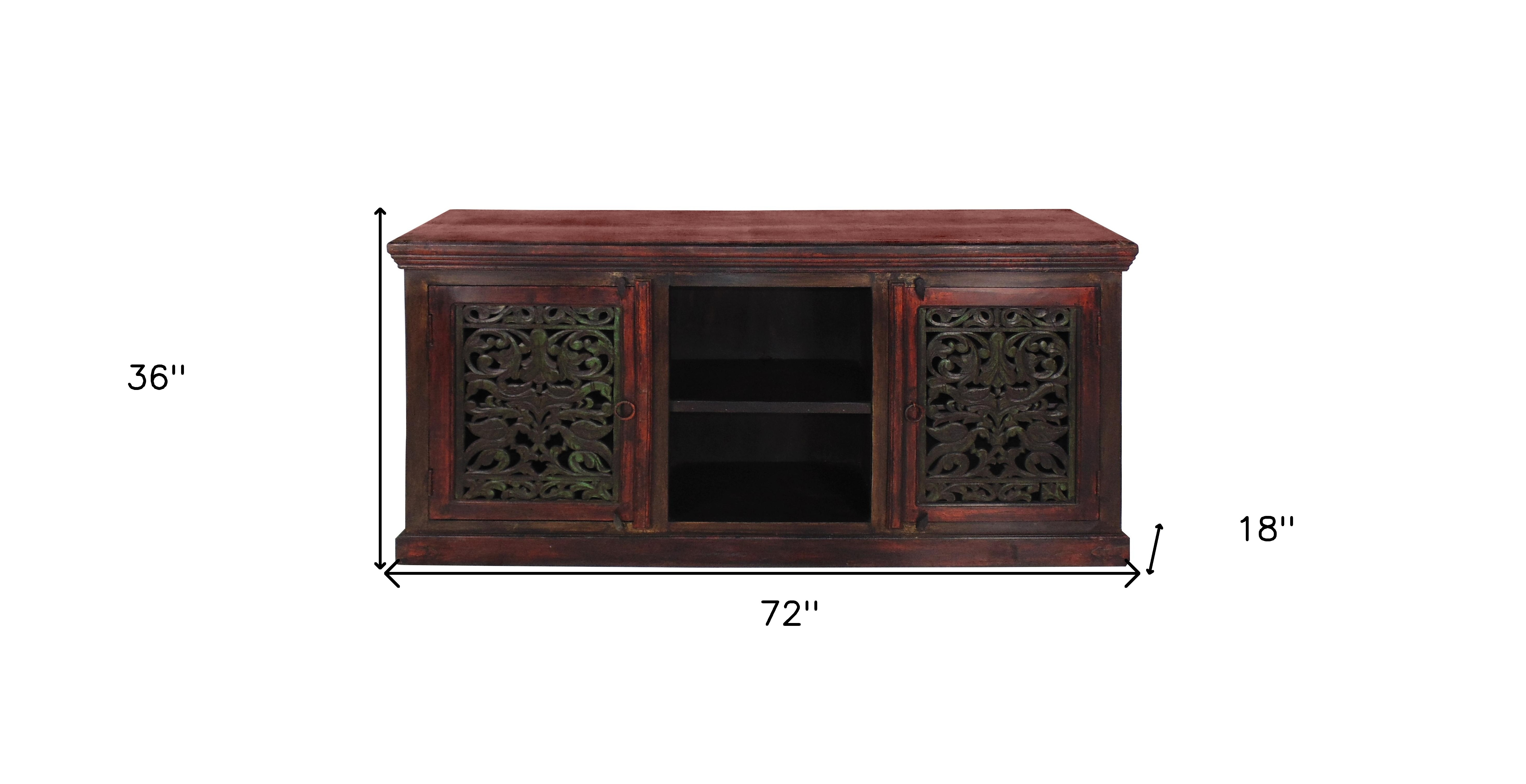 Ready to be enjoyed in your living room, family room, or recreation room, this 72-inch brown solid wood cabinet enclosed storage distressed tv stand is a practical and good looking piece of furniture that will help to anchor your room. Curated from high quality solid mango wood, this console is natural, beautiful, and built to last. Due to the genuine nature of the wood some natural wood knots, and grain and color variations may occur. E to add to the versatility, this piece features open non-concealed storage that can be used for not only storage but display as well. Ideal for tv placement and storage in your living room, bedroom or office. 36-inch H x 72-inch W x 18-inch D