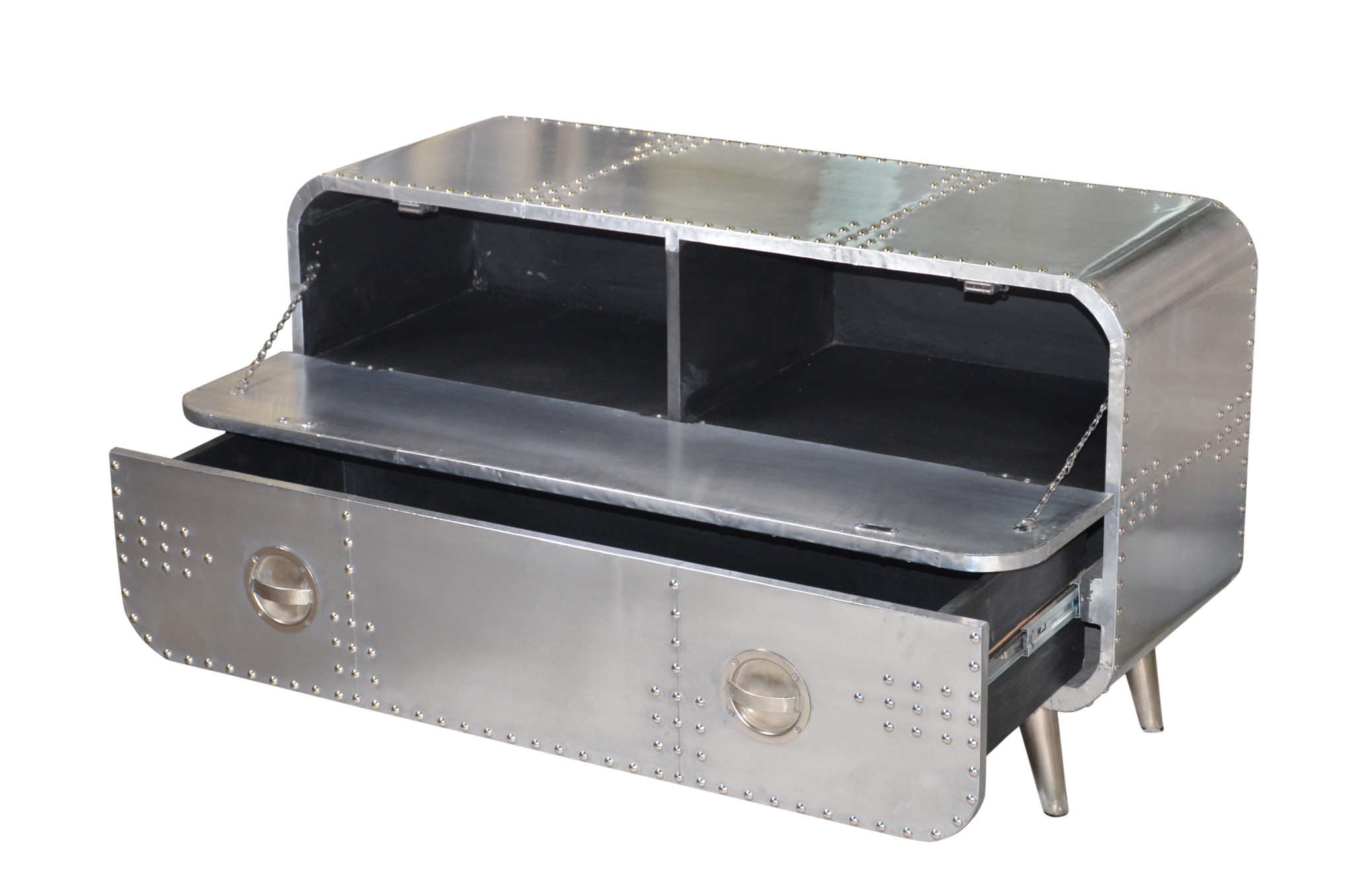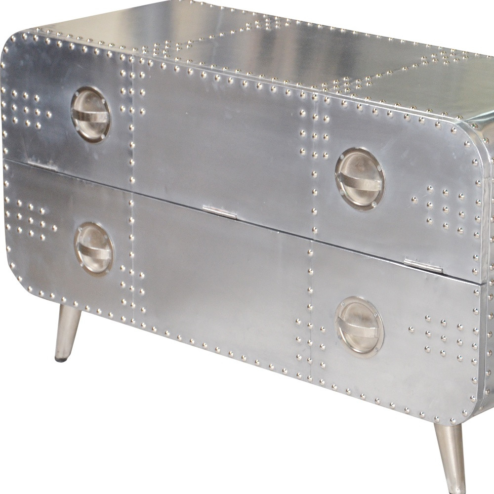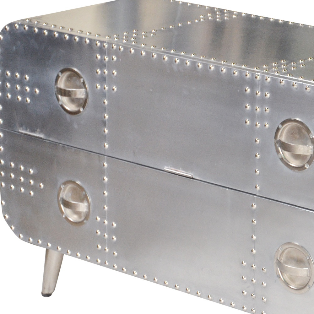 Practical, space saving, and good looking, this 44-inch silver aluminum enclosed storage tv stand is a versatile media storage solution. Designed to be sturdy and long lasting, this versatile furniture piece is crafted from durable riveted patchwork aluminum and features a cool aviator / industrial design style. Convert your room into a special place with your favorite collectibles and tv accessories that is suitable for living room, bedroom, or office. 26-inch h x 44-inch w x 16-inch d.