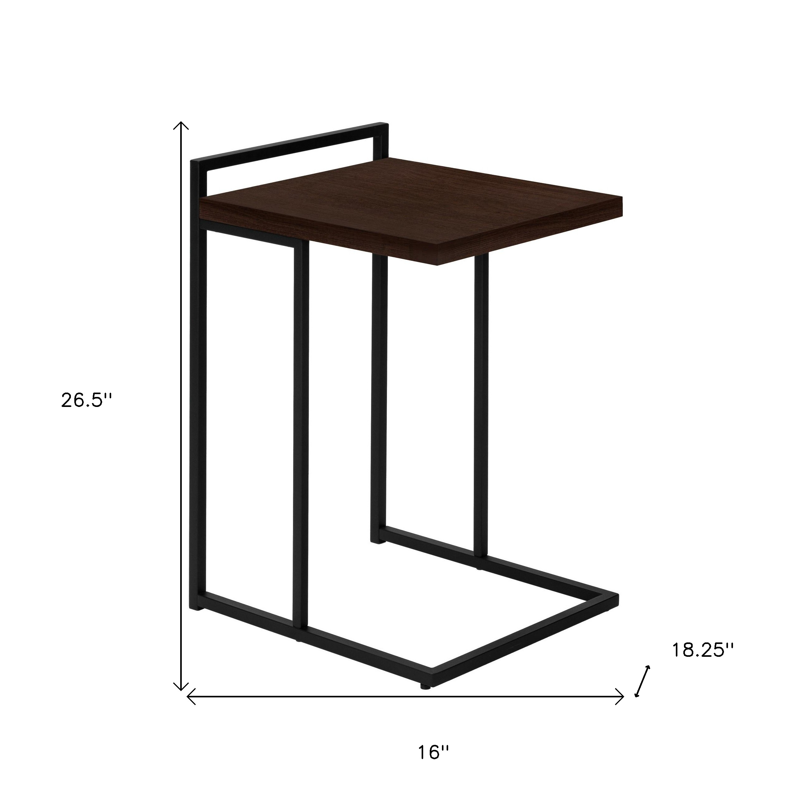 Optimize your space and add some charm to your room with the 27-inch espresso and black wood and metal end table. The base of this table is made from metal in a black color that is a nice contrast to the espresso manufactured wood tabletop. An ideal location for placing your snacks and drinks, and a place to keep your lamp, frames, or other accessories. You can match it with other pieces to get the ideal look for your place. 26.50-inch h x 16.00-inch w x 18.25-inch d.