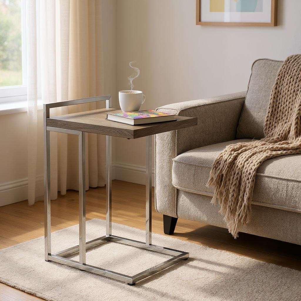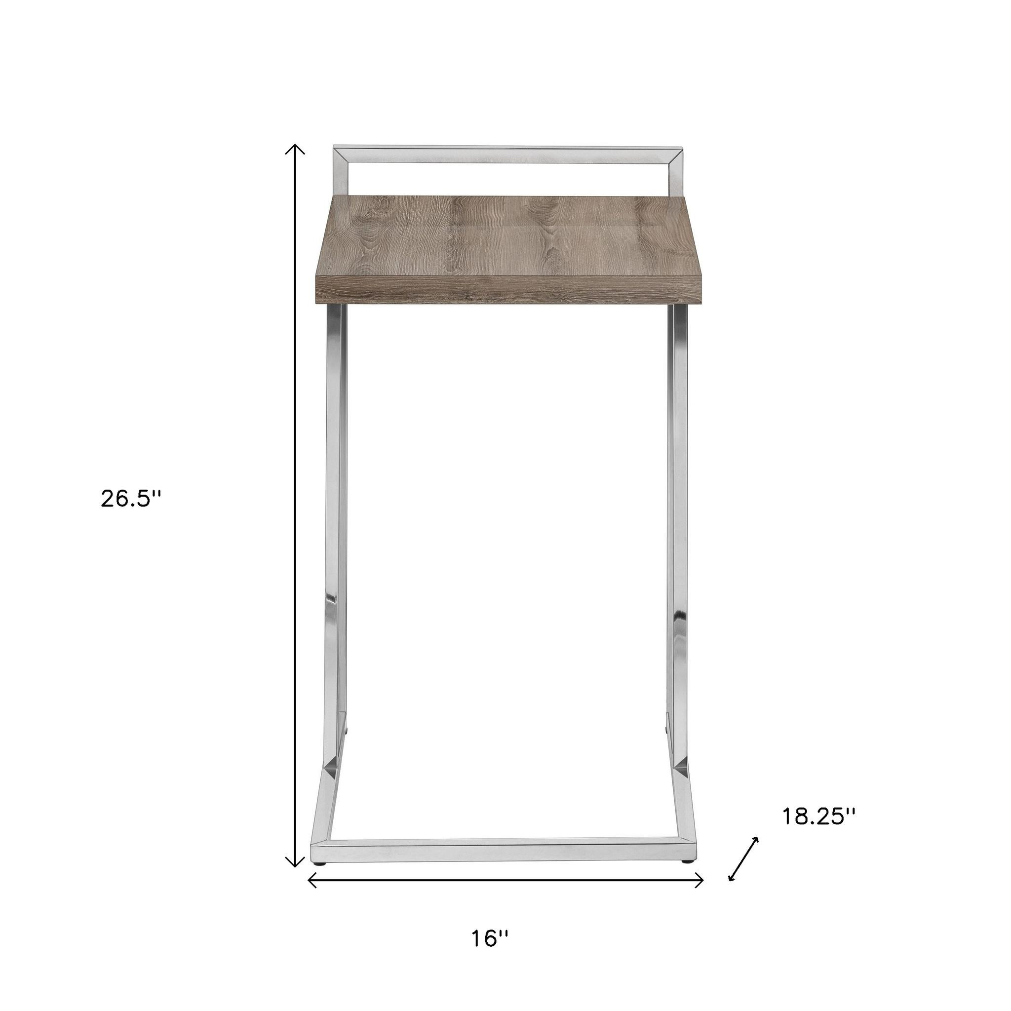 Show off your exquisite taste with this 27-inch taupe and silver wood and metal end table. Quality construction from the silver metal base combines with taupe manufactured wood of the top to give this table a fresh and updated look. Side tables are a great way to flank your sofa, use as an accent next to your favorite chair, or can even be used bedside. This versatile table is a great accent for most any room. 26.50-inch h x 16.00-inch w x 18.25-inch d.