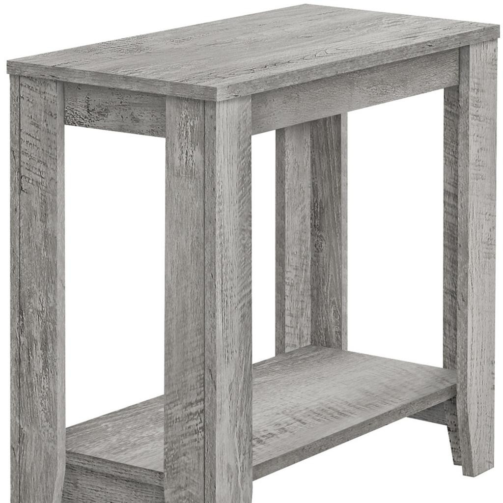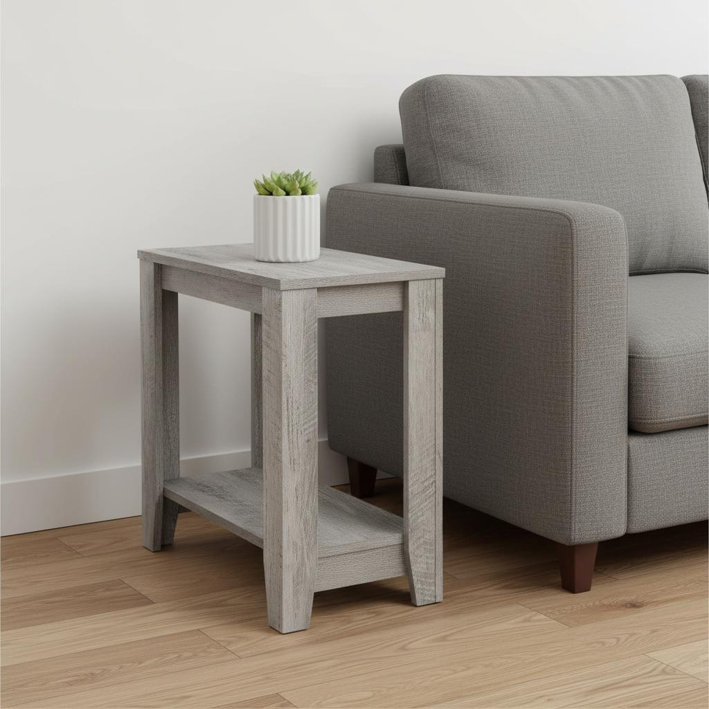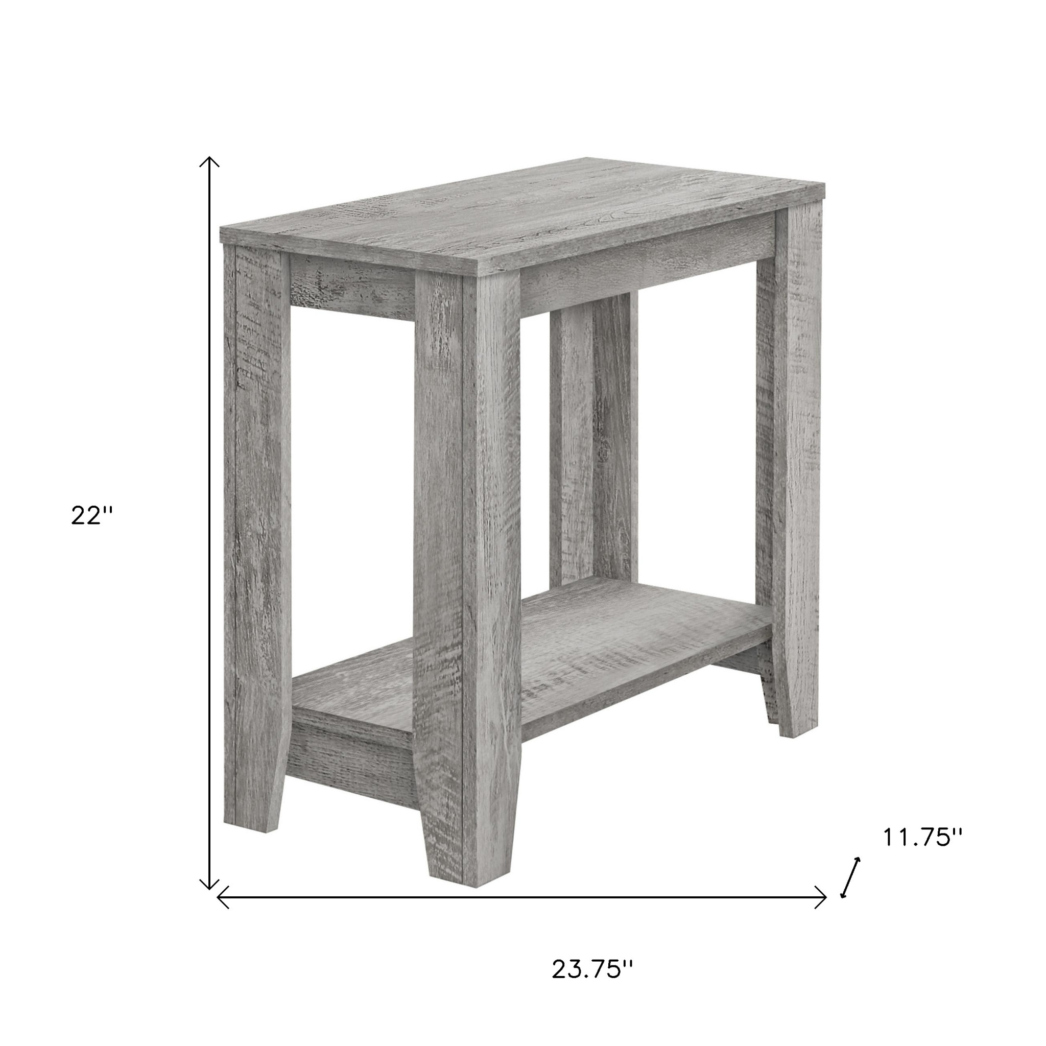 Show off your exquisite taste with this 22-inch gray end table with shelf. This table is made from manufactured wood in a gray color throughout the base and top. Help to keep your space organized with the included single shelf. An ideal location for placing your snacks and drinks, and a place to keep your lamp, frames, or other accessories. This versatile table is a great accent for most any room. 22-inch H x 23.75-inch W x 11.75-inch D