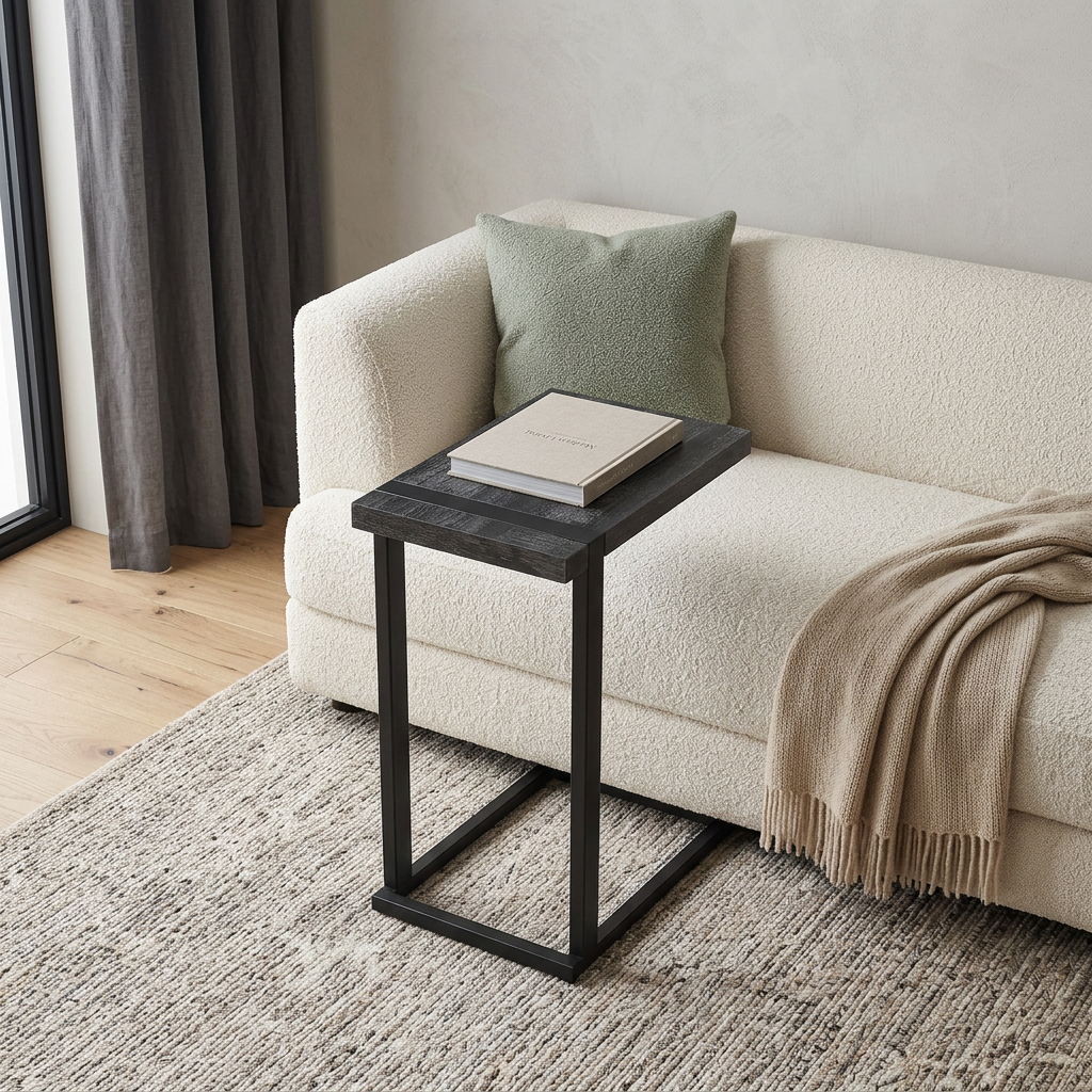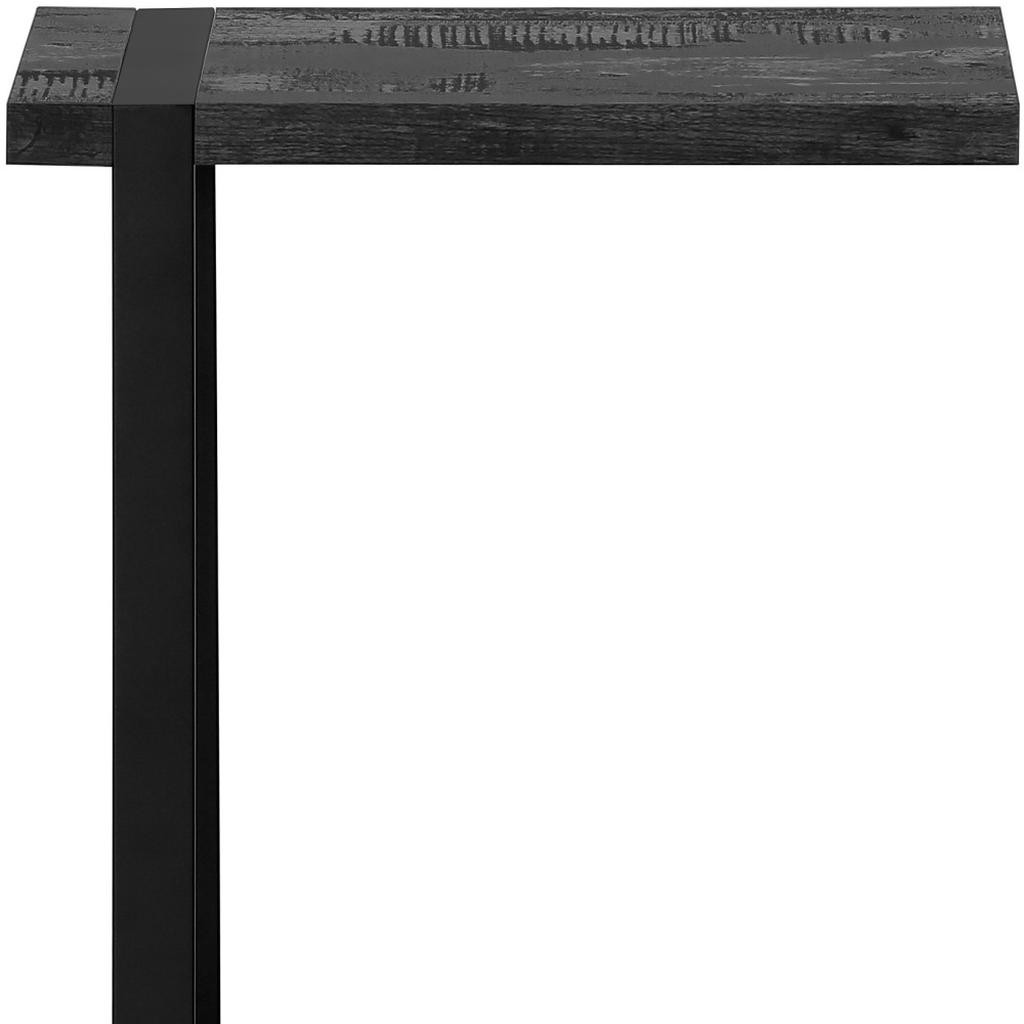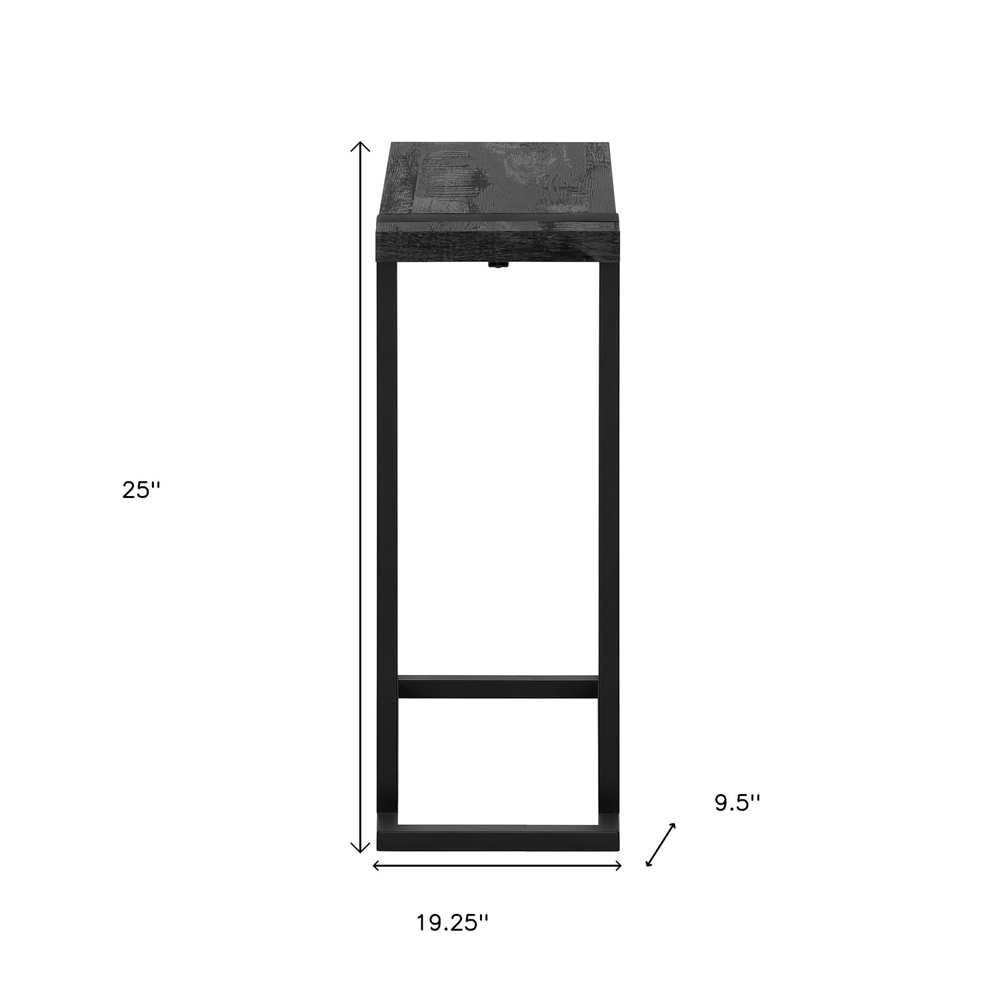 Distinctive in style the 25-inch black distressed wood and metal end table radiates a versatile charm. A sleek black monotone color gives this metal and manufactured wood table a fresh and updated look. The purposefully distressed finish gives this table an authentically rustic feel. An ideal location for placing your snacks and drinks, and a place to keep your lamp, frames, or other accessories. This versatile table is a great accent for most any room. 25.00-inch h x 19.25-inch w x 9.50-inch d.
