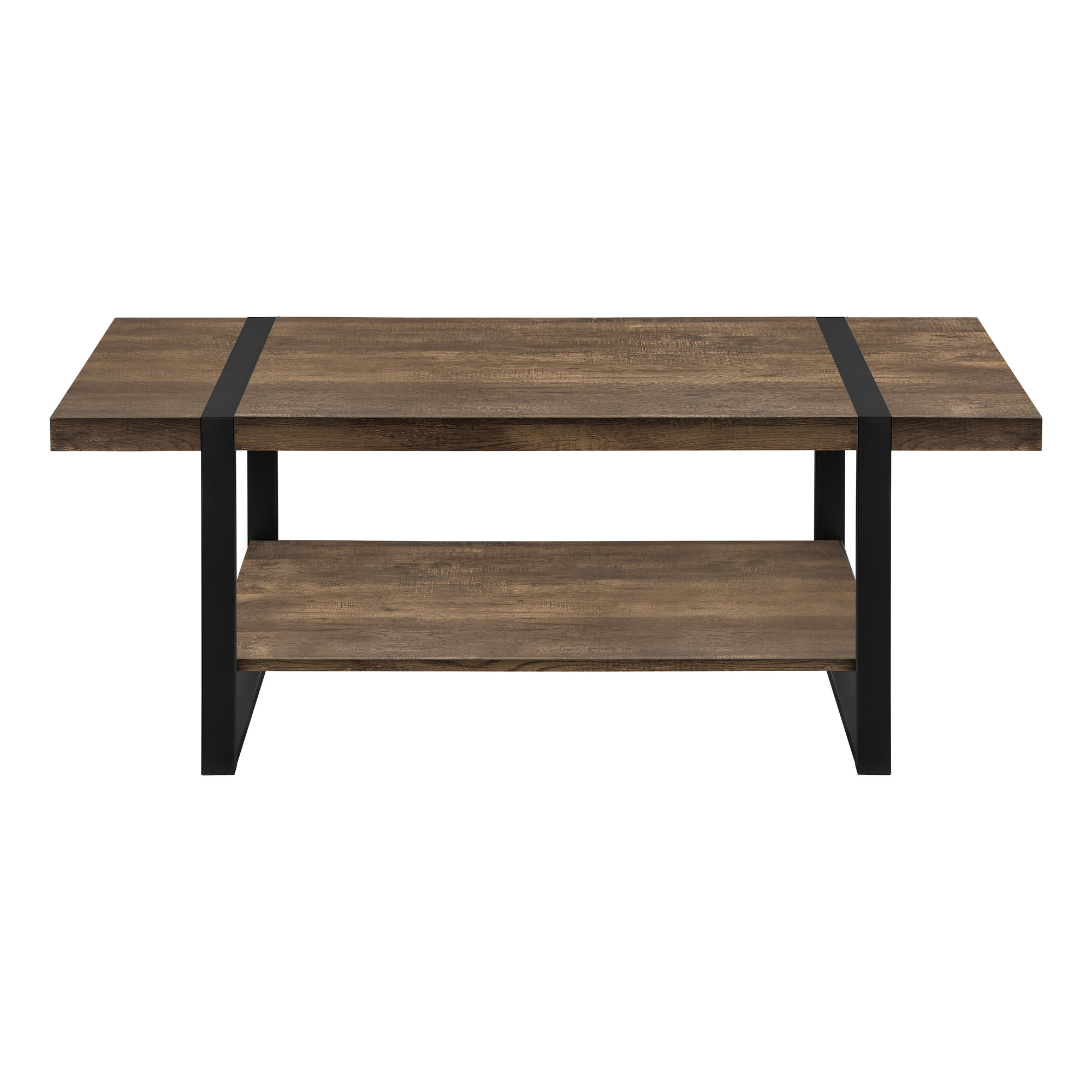 The top of this manufactured wood table is brown, while the base is a nice compliment in black. Help to keep your space organized with the included single shelf. This rectangular table is an classic yet updated way to accent your room. It has a fresh design that will definitely breathe some fresh air into your interior. This coffee table is the sturdy, reliable and stylish answer to your living room needs. 17.75" H x 47.25" W x 23.75" D