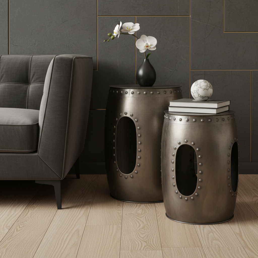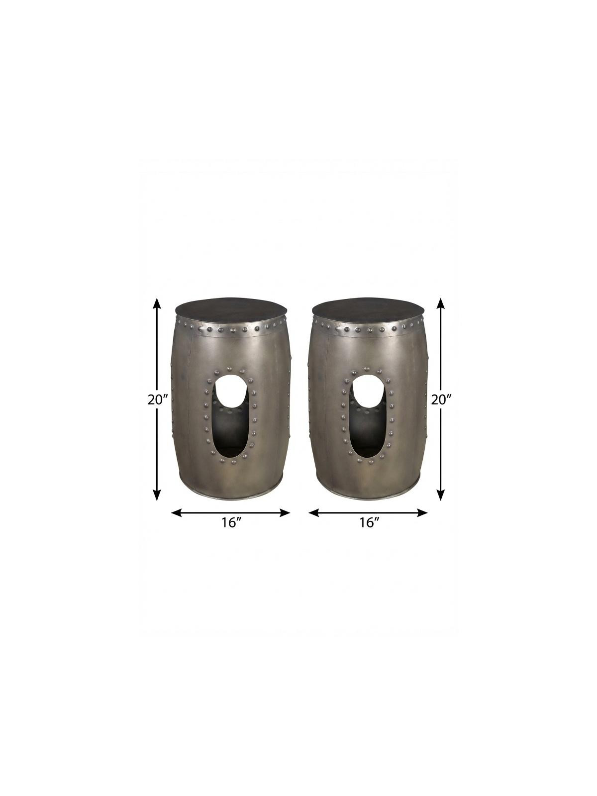 iron round drum end tables, round drum end tables, drum end tables, nickel iron round drum end, set nickel iron round drum |