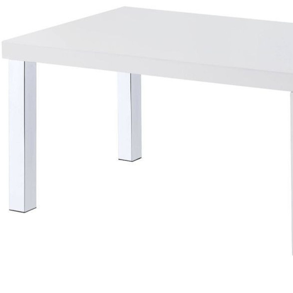 Make a statement with the 47-inch white and silver wood and metal frame coffee table with shelf and infuse a dash of character and personality into your space. The base of this table is made from metal in a silver color that creates a good looking visual contrast to the white manufactured wood tabletop. Help to keep your space organized with the included single shelf. This classic rectangular table will be a great accent in any room if you're looking for something that can fit into a living area, bedroom, or office, this coffee table is for you. 18-inch h x 47-inch w x 24-inch d.
