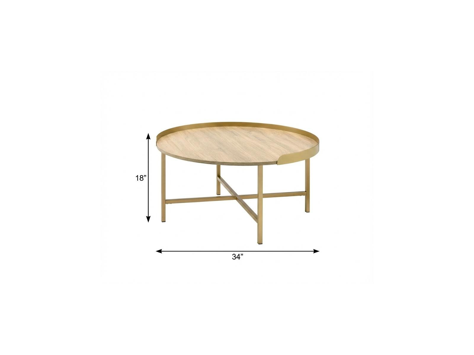 Add handsome, fashionable design to your living space with this 34-inch oak and gold wood and metal round sled coffee table. The base of this table is made from metal in a gold color that creates a good looking visual contrast to the oak manufactured wood tabletop. This unique tray top shape of the table adds dimension and extra storage. This round table utilizes its unique shape to give your room a modern geometric accent. If you're looking for something that can fit into a living area, bedroom, or office, this coffee table is for you. 18-inch h x 34-inch w x 34-inch d.