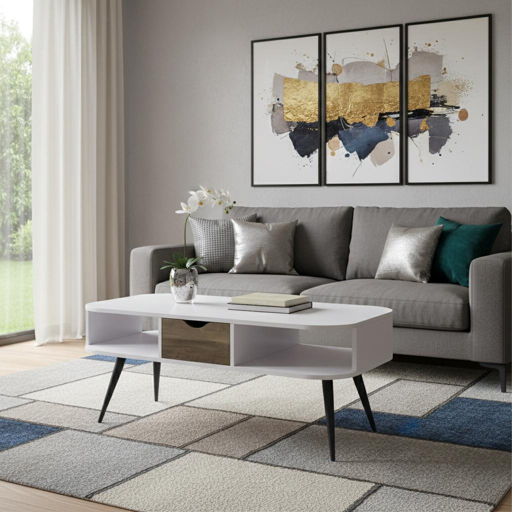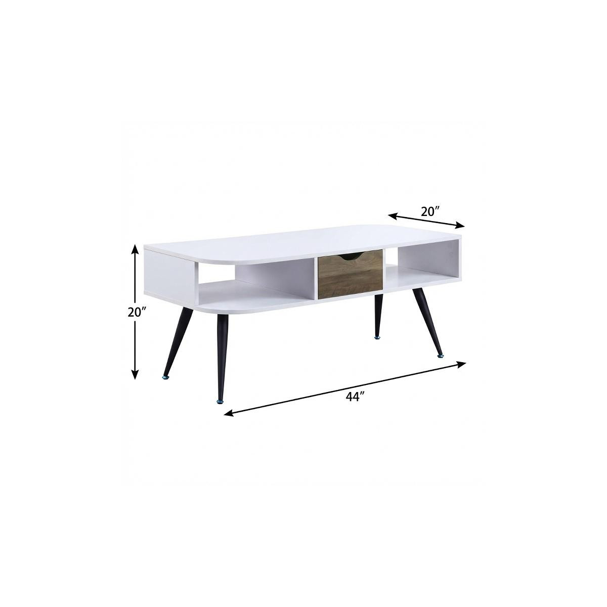 Make your living room or family room really stand out with this 44-inch white and black melamine veneer and metal coffee table with drawer and shelf. The white melamine veneer top of this table is a nice visual contrast to the high quality, black metal of the base. Includes a single shelf for handy storage or display space. This rectangular table is an classic yet updated way to accent your room. It has an attractive design that will definitely breathe some fresh air into your interior. 20-inch h x 44-inch w x 20-inch d.
