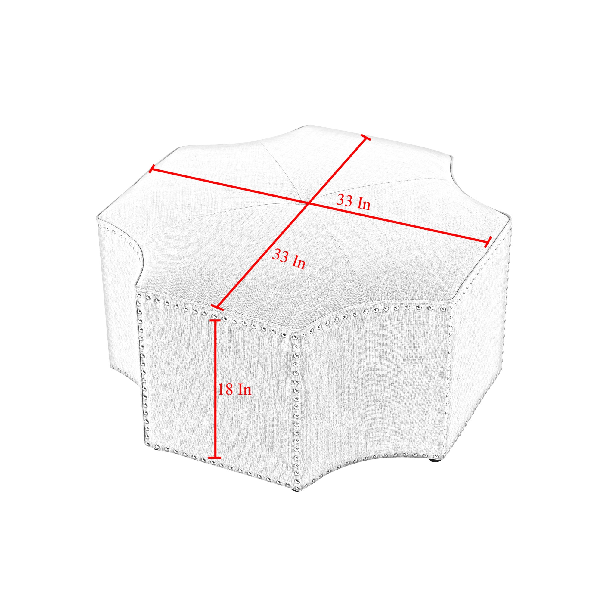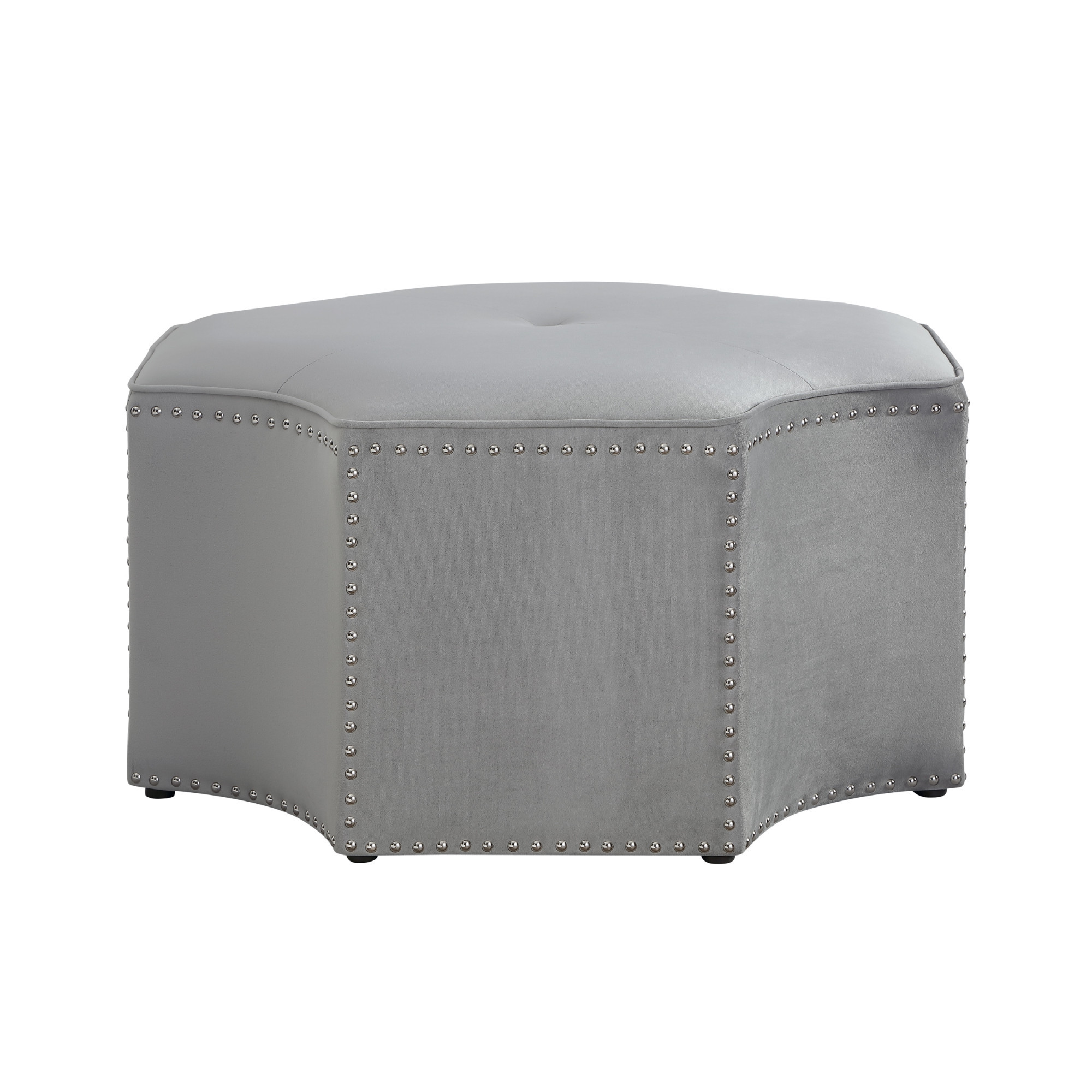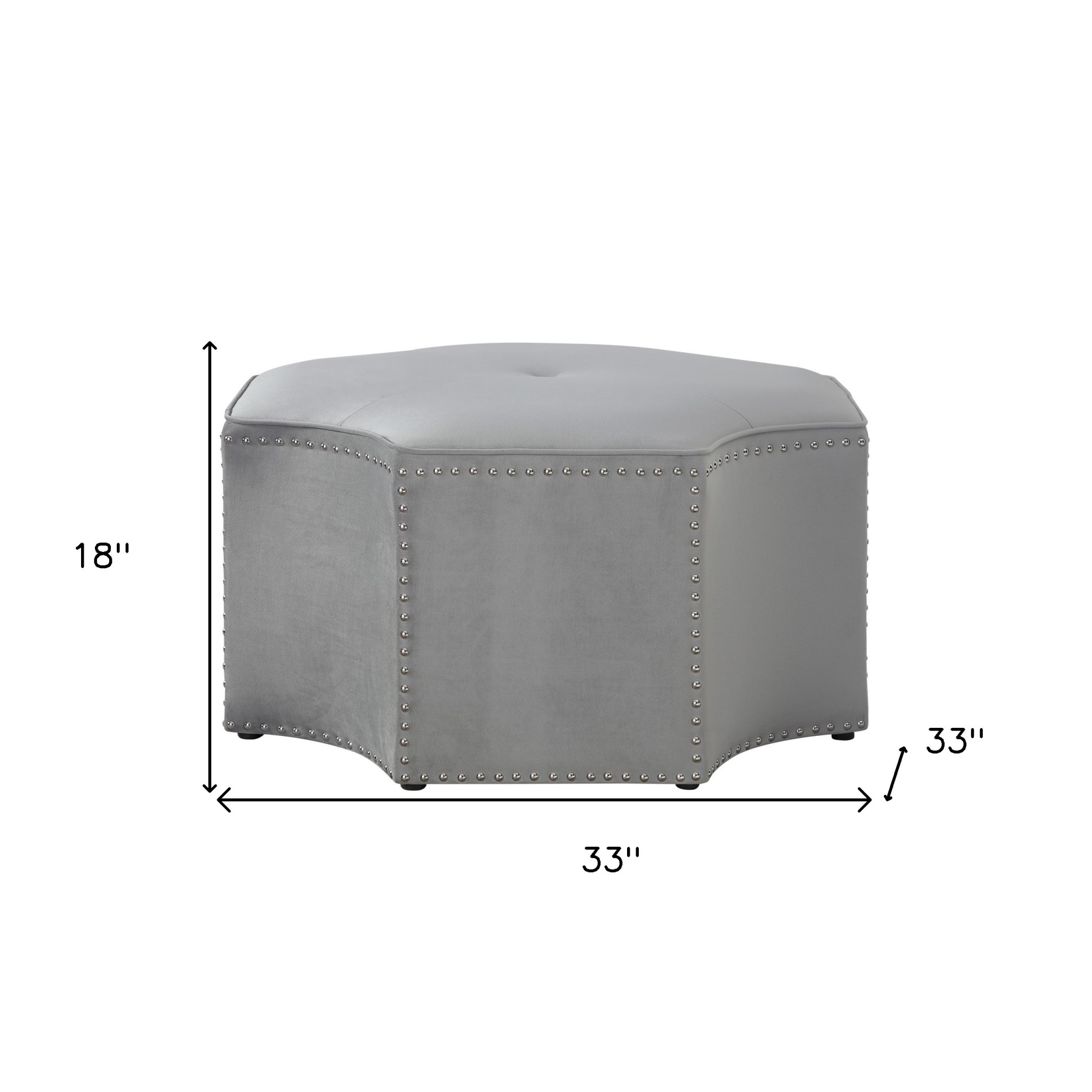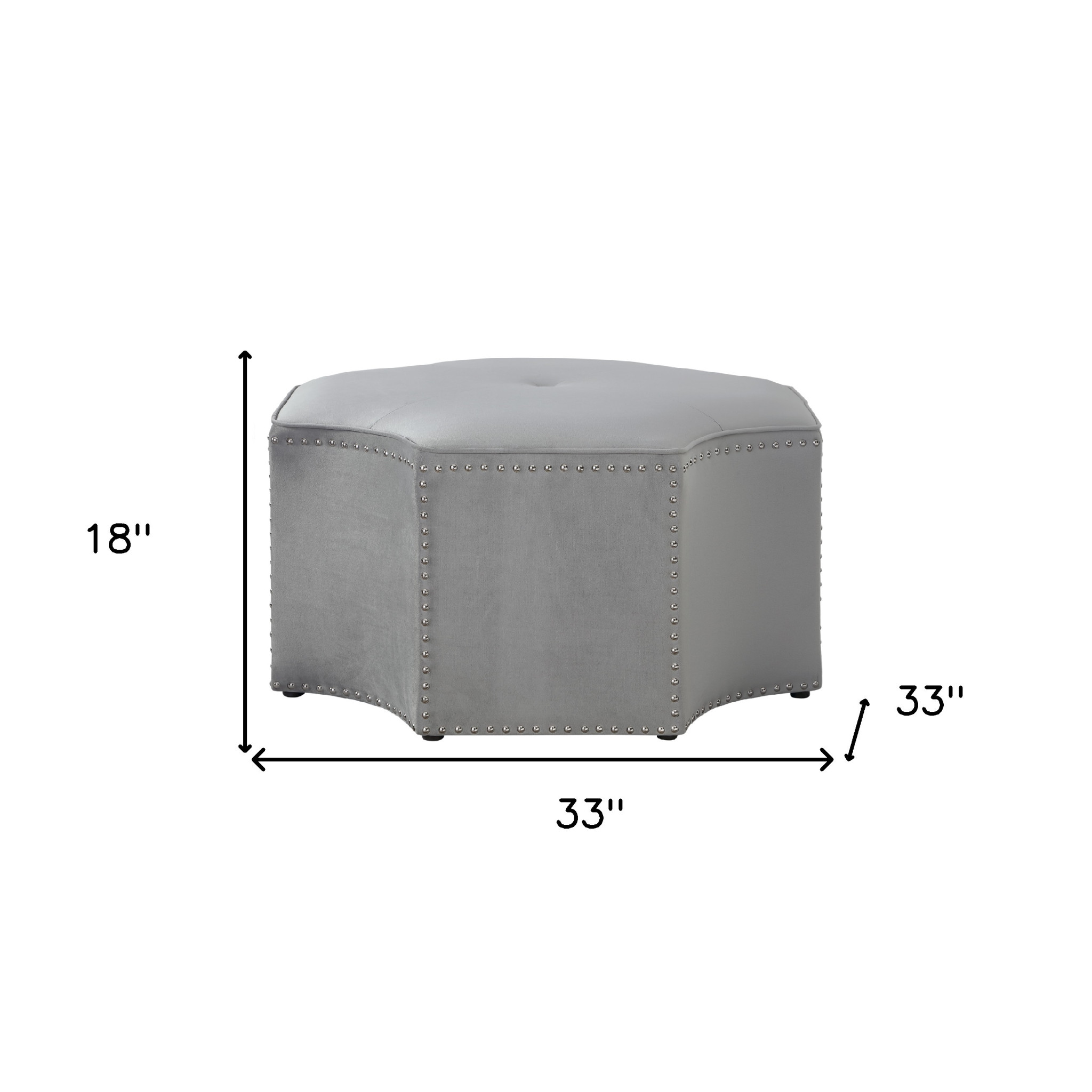 Get ready to relax with this 33-inch gray velvet tufted octagonal cocktail ottoman. This chic ottoman is larger in size and designed to serve as a make-shift coffee table during parties. The surface is wide and flat which is not only suitable for a footrest or seat but also ready to hold trays of appetizers, drinks, or desserts. Expertly upholstered with padding in a soft solid color velvet and accented with nail head trim, this ottoman is as comfortable as it is good looking. 18-inch H x 33-inch W x 33-inch D