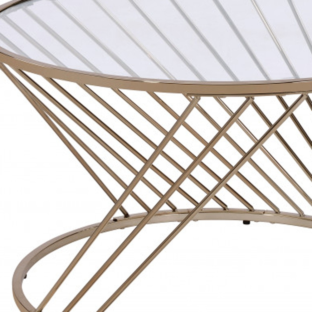 This stylish 32-inch clear and champagne glass and metal round frame coffee table is not only practical, but good looking and built to last. The champagne coloration of the high quality metal base marries nicely with the clear glass top surface. This round table features a fresh and stylish shape to give your room a visually pleasing accent. If you're looking for something that can fit into a living area, bedroom, or office, this coffee table is for you. 18-inch h x 32-inch w x 32-inch d.