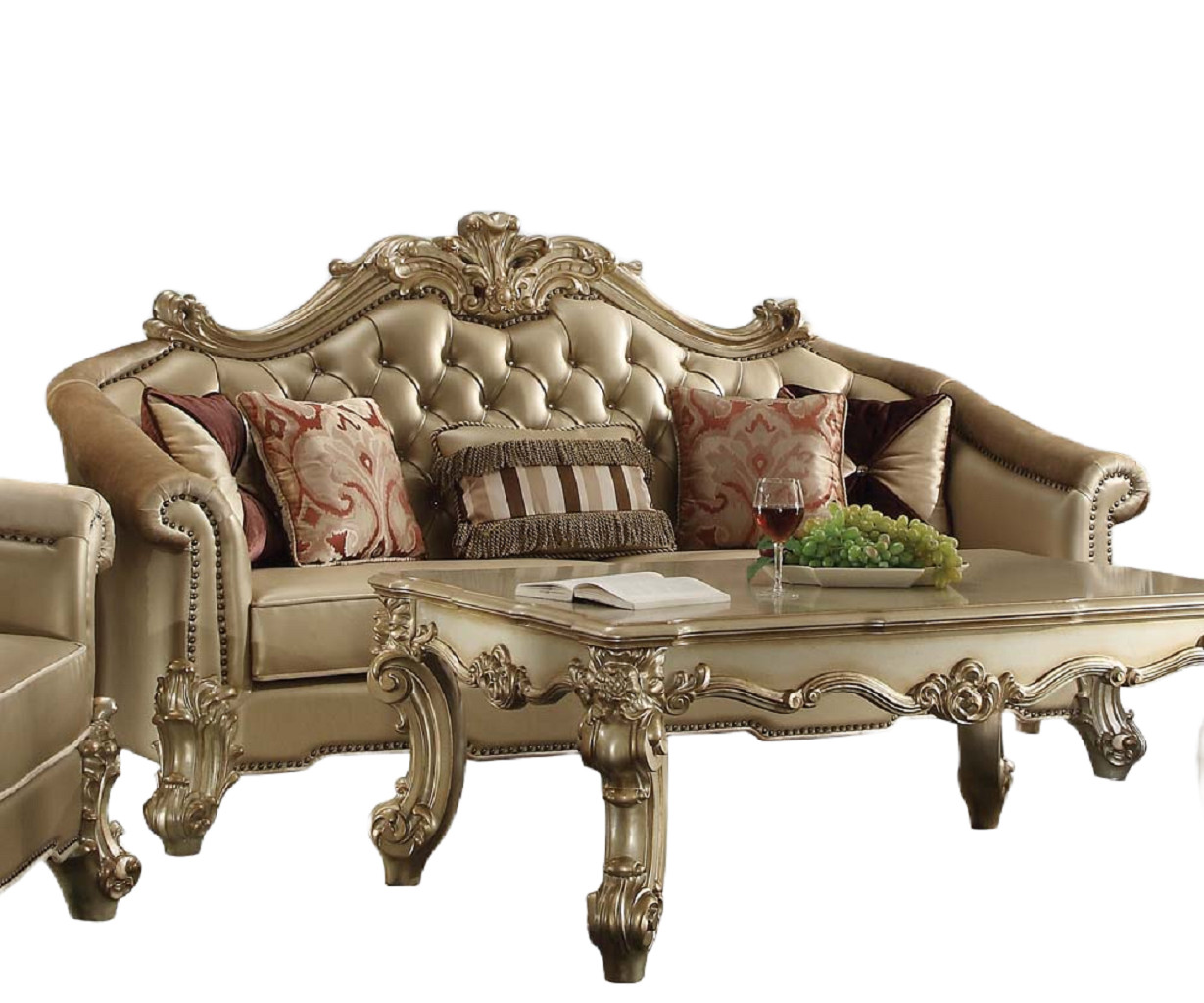With a look and feel like leather, this 89-inch bone faux leather sofa and toss pillows with gold legs is made from sturdy and resilient polyurethane to stand up to the test of time. Solid colors give you lots of decorative options and are easy to work into your decor scheme. Sinuous springs construction gives this piece strong support and makes it comfortable to sit even for long periods of time. This piece includes high end detailing such as nailhead trim for a refined look. Rolled arms offer a comfy place to rest. The tufted stitching pattern adds visual interest and fine designer detailing. Built to last, this sofa will be a great centerpiece for your room. 49-inch H x 89-inch W x 44-inch D