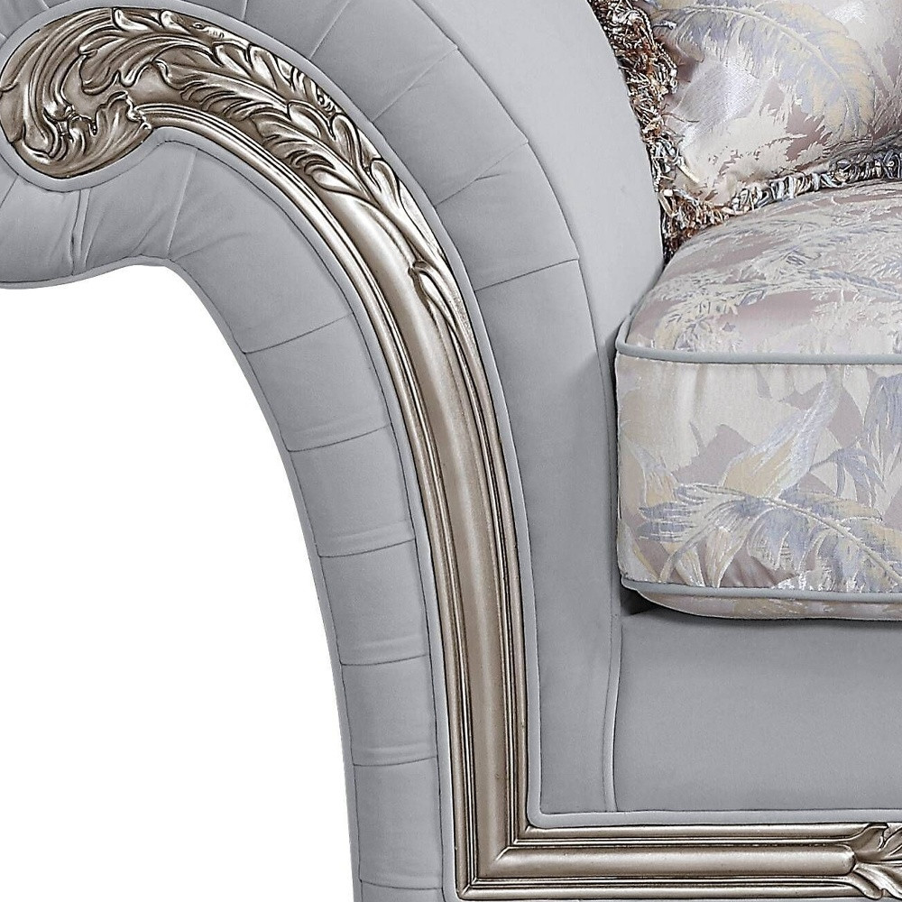 Unique and decorative, this 62-inch light gray and platinum linen floral club chair and toss pillows will leave a lasting impression. This updated yet classic light gray floral club chair is masterfully upholstered in durable linen. The sturdy inner frame is built with high quality manufactured wood, includes armrests, and features a fixed back that is accented with soft and comfortable cushioning. Includes 3 toss pillows to complete the look. 44-inch h x 62-inch w x 40-inch d.