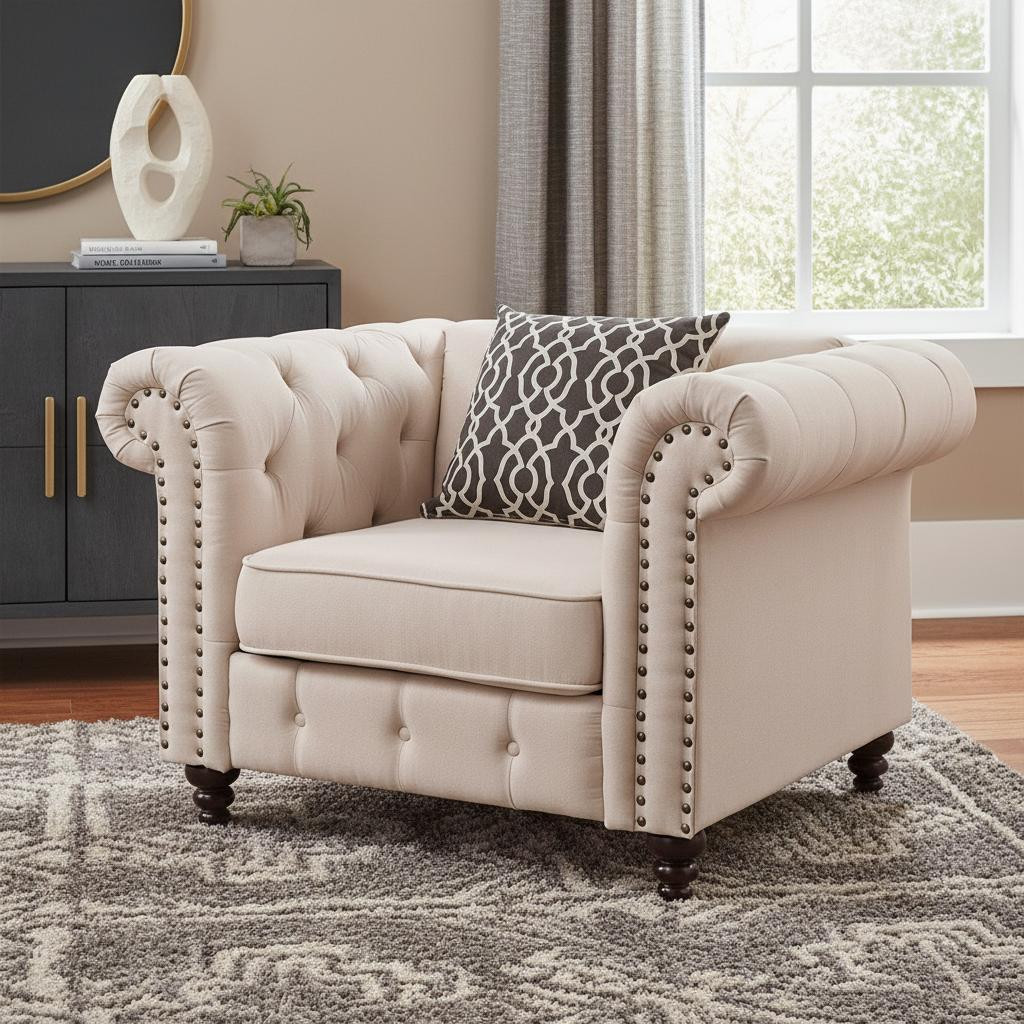 This 45-inch beige and black linen tufted chesterfield chair and toss pillow is the perfect decorative yet functional accessory for your home. Built to last this chesterfield chair is finished in solid beige linen to give your room a great update. The high quality manufactured wood inner frame flaunts convenient armrests and a fixed back that are complimented by soft and comfortable cushioning. The tufted cushions add fine designer detailing and are removable for convenience. Nailhead trim gives this chair a refined look that adds additional texture and visual interest. Comes complete with a decorative toss pillow to give the chair the perfect accent. 30-inch h x 45-inch w x 33-inch d.