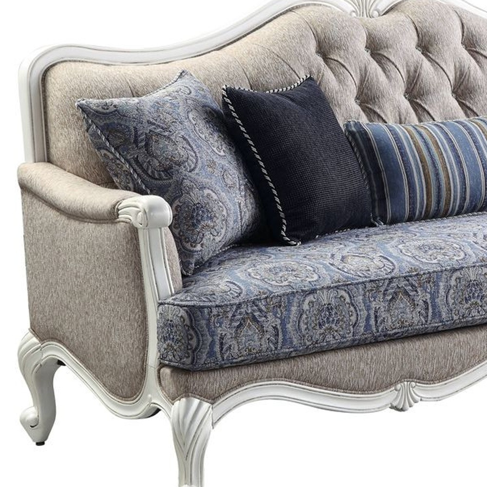 Designed for comfort and good looks, this 88-inch cream linen damask sofa and toss pillows with white legs is a great option to anchor your space. Sinuous springs construction gives this piece strong support and makes it comfortable to sit even for long periods of time. Square arms offer a comfy place to rest. A great showpiece for your room, this sofa is a must have. 42-inch H x 88-inch W x 37-inch D
