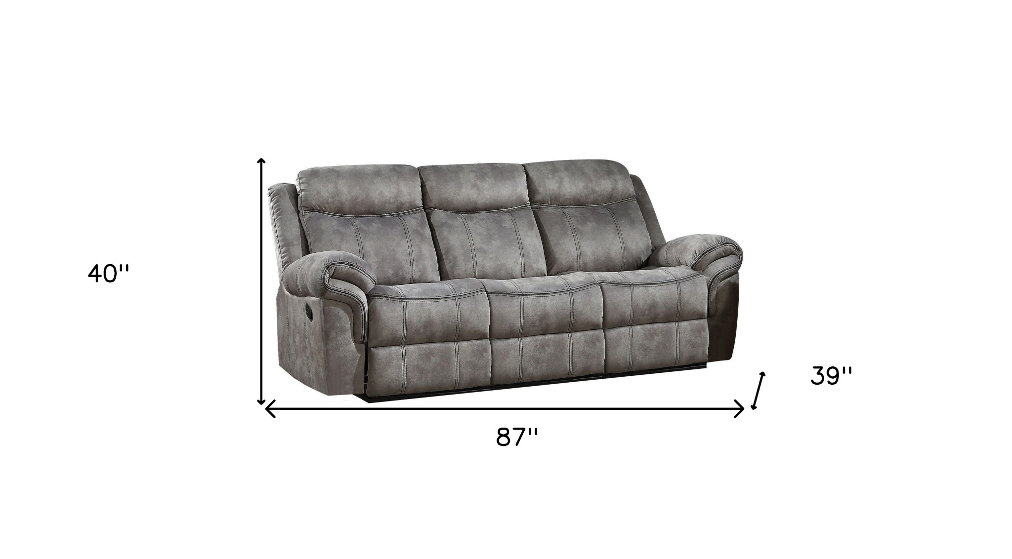 Add an air of fashion to your space with this fabulous 87-inch gray velvet reclining usb sofa with black legs. With a warm and rich look to it, this solid color reclining is upholstered in velvet that is designed to be super soft to the touch, sturdy and resilient. Solid colors give you lots of decorative options and are easy to work into your decor scheme. Sinuous springs construction gives this piece strong support and makes it comfortable to sit even for long periods of time. Pillow top arms offer a comfy place to rest. The tufted stitching pattern adds visual interest and fine designer detailing. Built to last, this sofa will be a great centerpiece for your room. 40-inch H x 87-inch W x 39-inch D