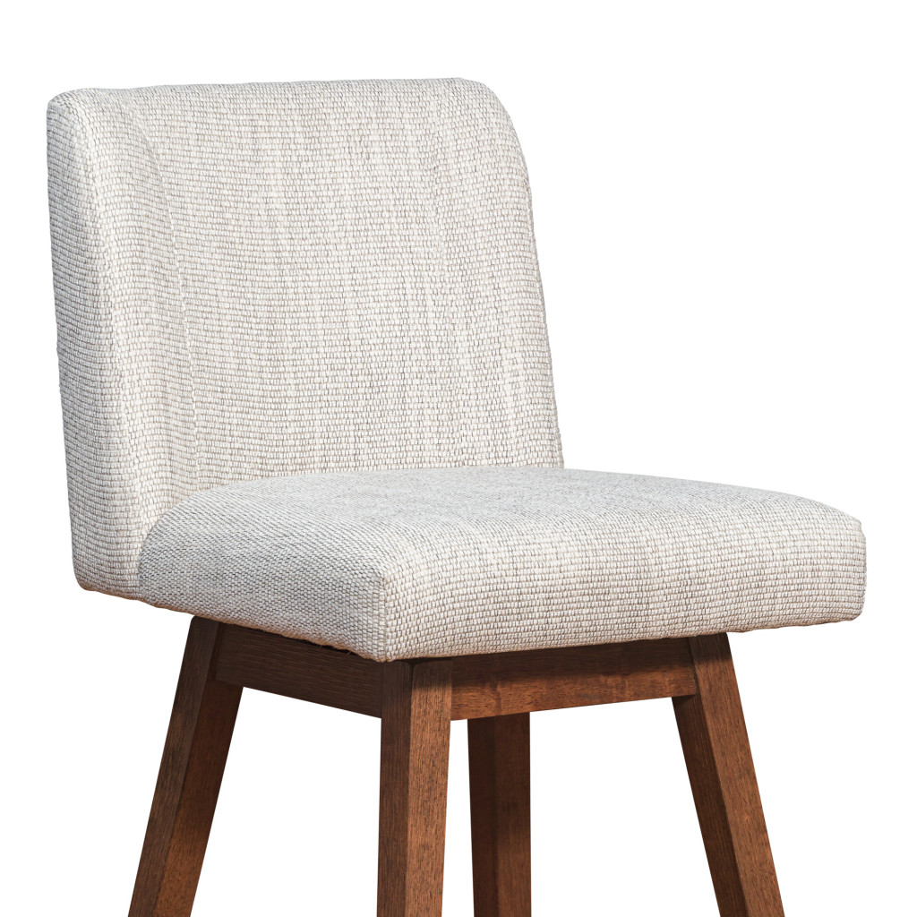 This 30-inch beige and brown upholstered and solid wood swivel bar height bar chair will be the perfect way to add some cool design and utility to your space similar to what you find in your favorite cafes or pubs. The wood brown coloration of the high quality solid wood base marries nicely with the beige upholstered seat. Not only good looking and stylish, this chair features a rectangle shaped seat and a full back for the ultimate in comfort and enjoyment. Designed with armrests for your comfort, this chair also features a footrest for comfort and convenience. 40.5-inch H x 22.5-inch W x 19-inch D