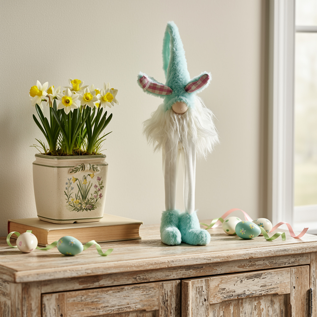 This 23-inch blue and white fabric standing gnome tabletop sculpture is a great way to celebrate and decorate for the holidays. This handmade piece showcases a whimsical design, perfect for adding a touch of charm to your festive decor. With pink plaid bunny ears, this adorable gnome is ready to add some smiles and joy to your space for Spring or Easter. 22.80-inch h x 4.00-inch w x 4.70-inch d.