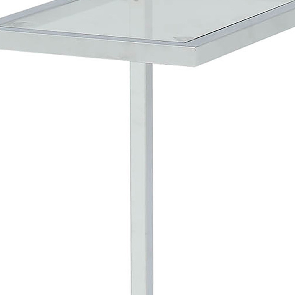 Distinctive in style the 26-inch clear and white glass and steel sled end table radiates a versatile charm. The base of this table is made from steel in a white color that is a nice contrast to the clear glass tabletop. A great accent on either side of the sofa or bed, this adorable end or side table is just what you need. You can match it with other pieces to get the ideal look for your place. 25.5-inch h x 10-inch w x 16-inch d.