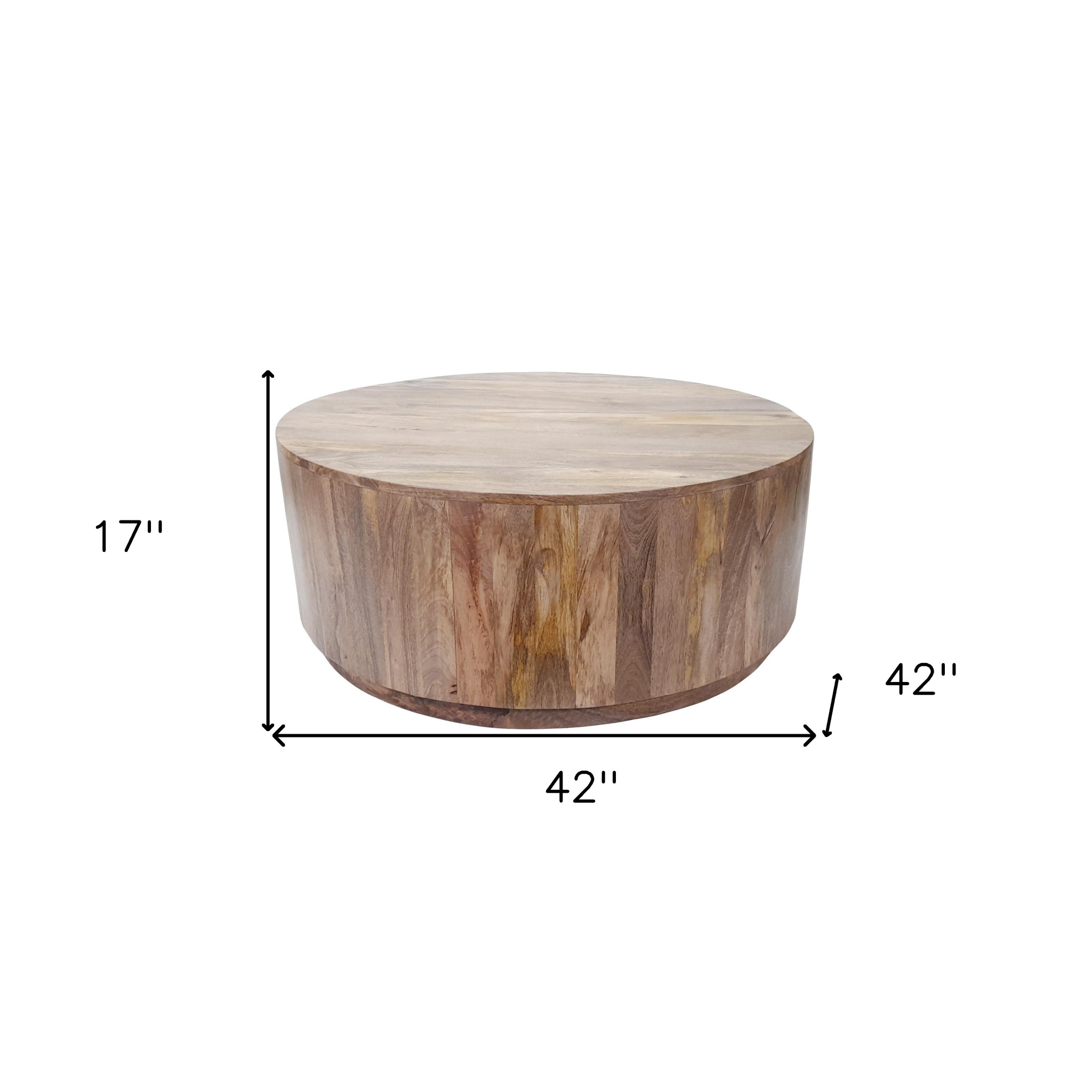 Create an inspiring atmosphere in most any room with this natural solid wood table. This unique drum shape of the table adds dimension and visual interest. This round table utilizes its unique shape to give your room a modern geometric accent. It has a fresh design that will definitely breathe some fresh air into your interior. This coffee table is the sturdy, reliable and stylish answer to your living room needs. 17" H x 42" W x 42" D