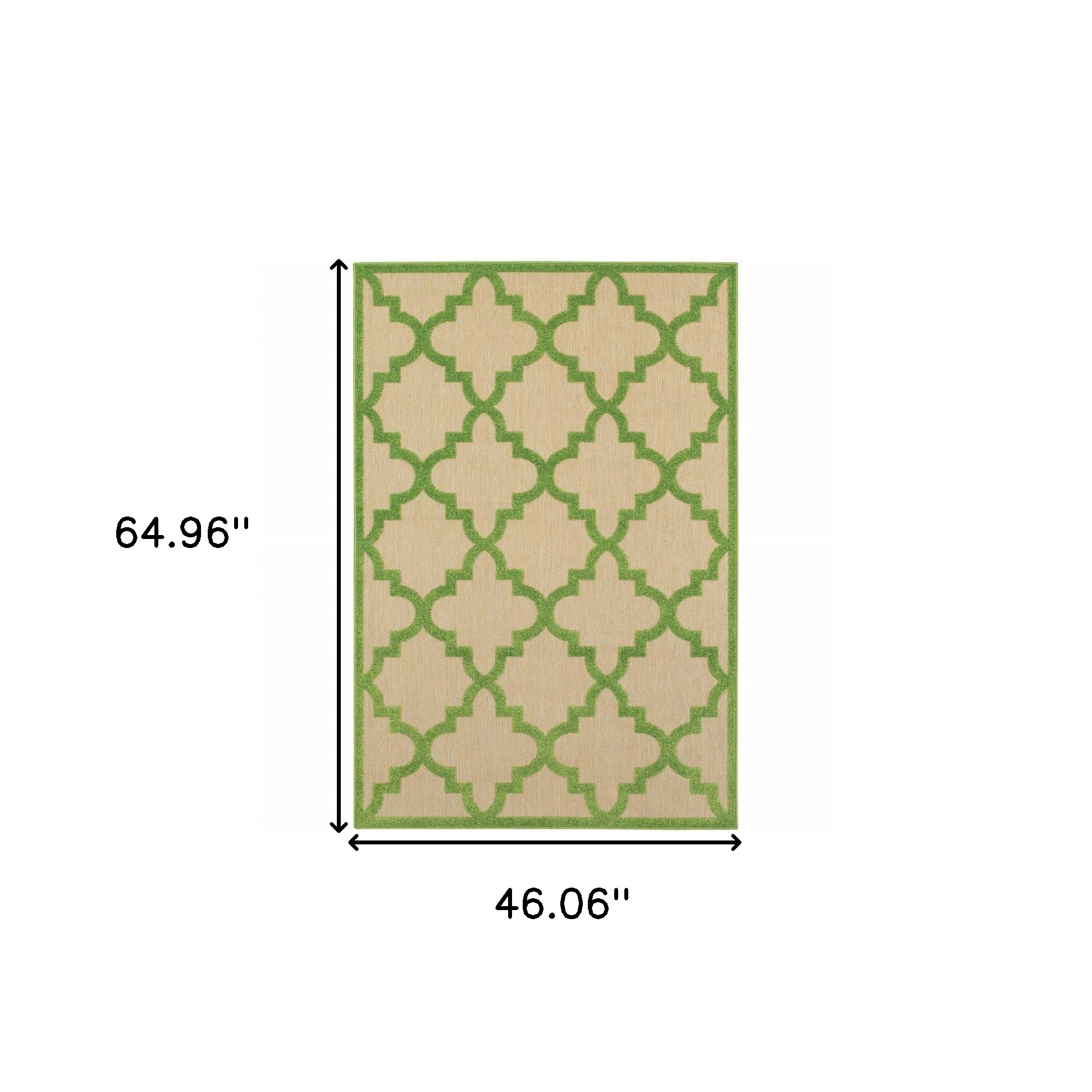 Add some artistry to your room with this 4-foot x 5-foot green geometric stain resistant indoor outdoor area rug. This rectangle shaped rug features a geometric design in green to give it visual interest. A classic shape marries with good looking design for your space Ideal for spaces with kids and pets, this rug is stain resistant to help repel stains and spilled liquids. Area Rugs help to give warmth and sense of home to your space. 0.07-inch H x 46.06-inch W x 64.96-inch D